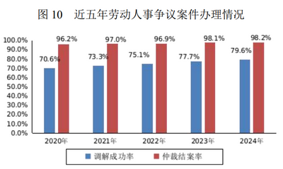 全年全國各級勞動人事爭議調(diào)解組織和仲裁機構(gòu)共辦理勞動人事爭議案件 425.7 萬涉及勞動者 454.9 萬人。全年辦結(jié)爭議案件 415.6 萬件,結(jié)案金額 934.7 億元。全年勞動人事爭議調(diào)解成功率 79.6%,仲裁結(jié)案率 98.2%,仲裁終結(jié)率73.7%。