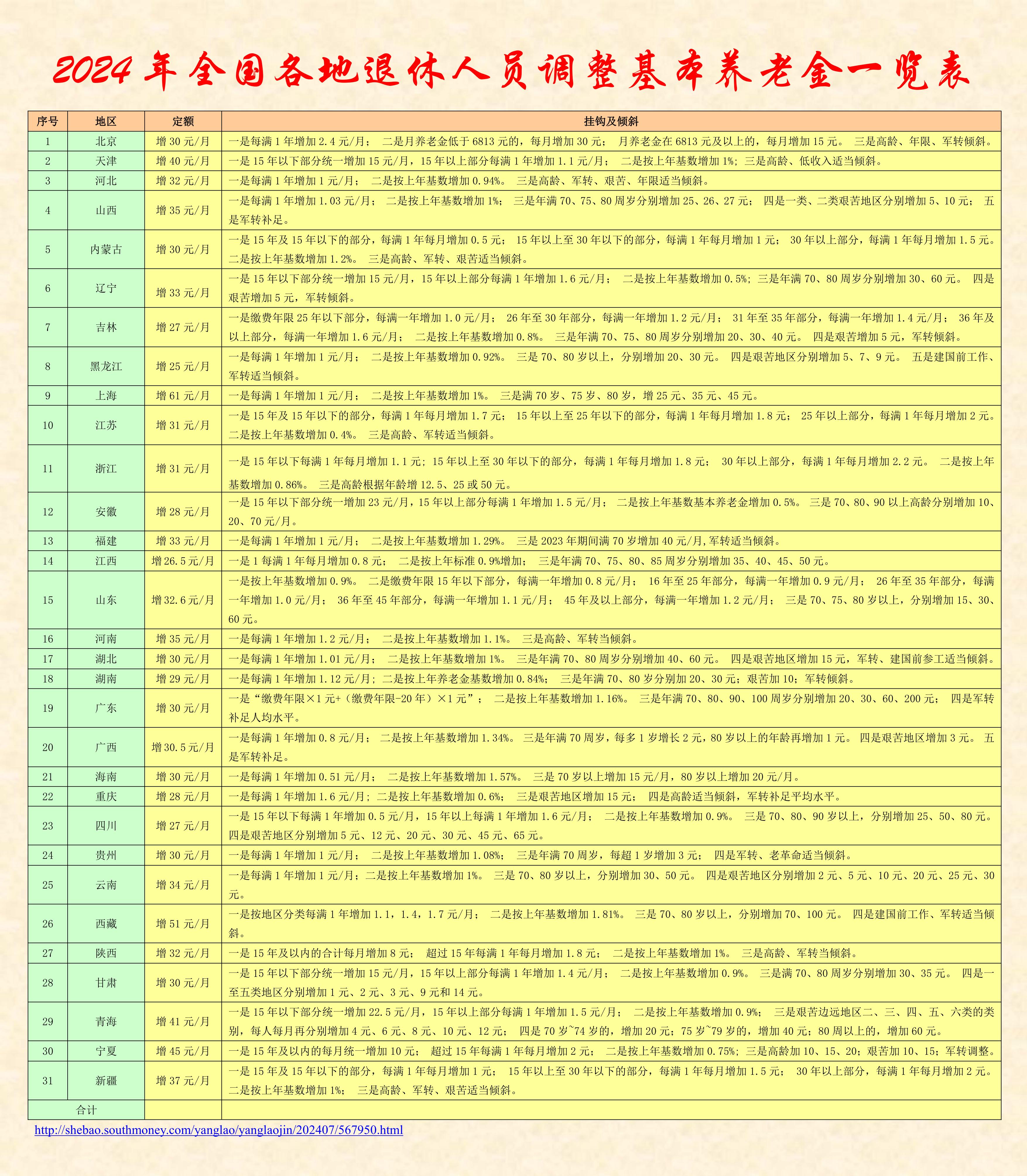 【行業(yè)資料】2024年全國各地退休人員調(diào)整基本養(yǎng)老金一覽表