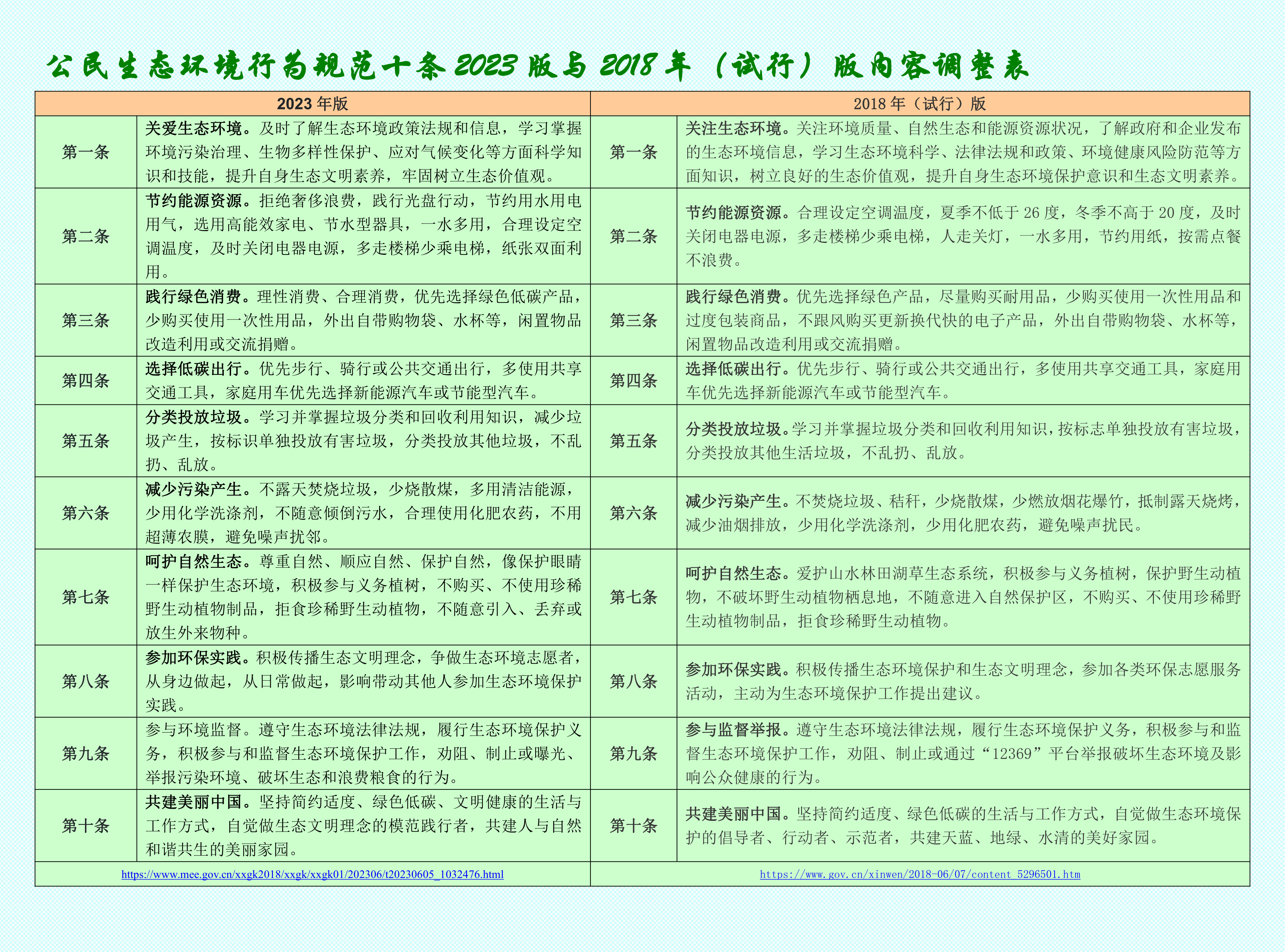 公民生態(tài)環(huán)境行為規(guī)范十條2023版與2018年試行版調(diào)整表