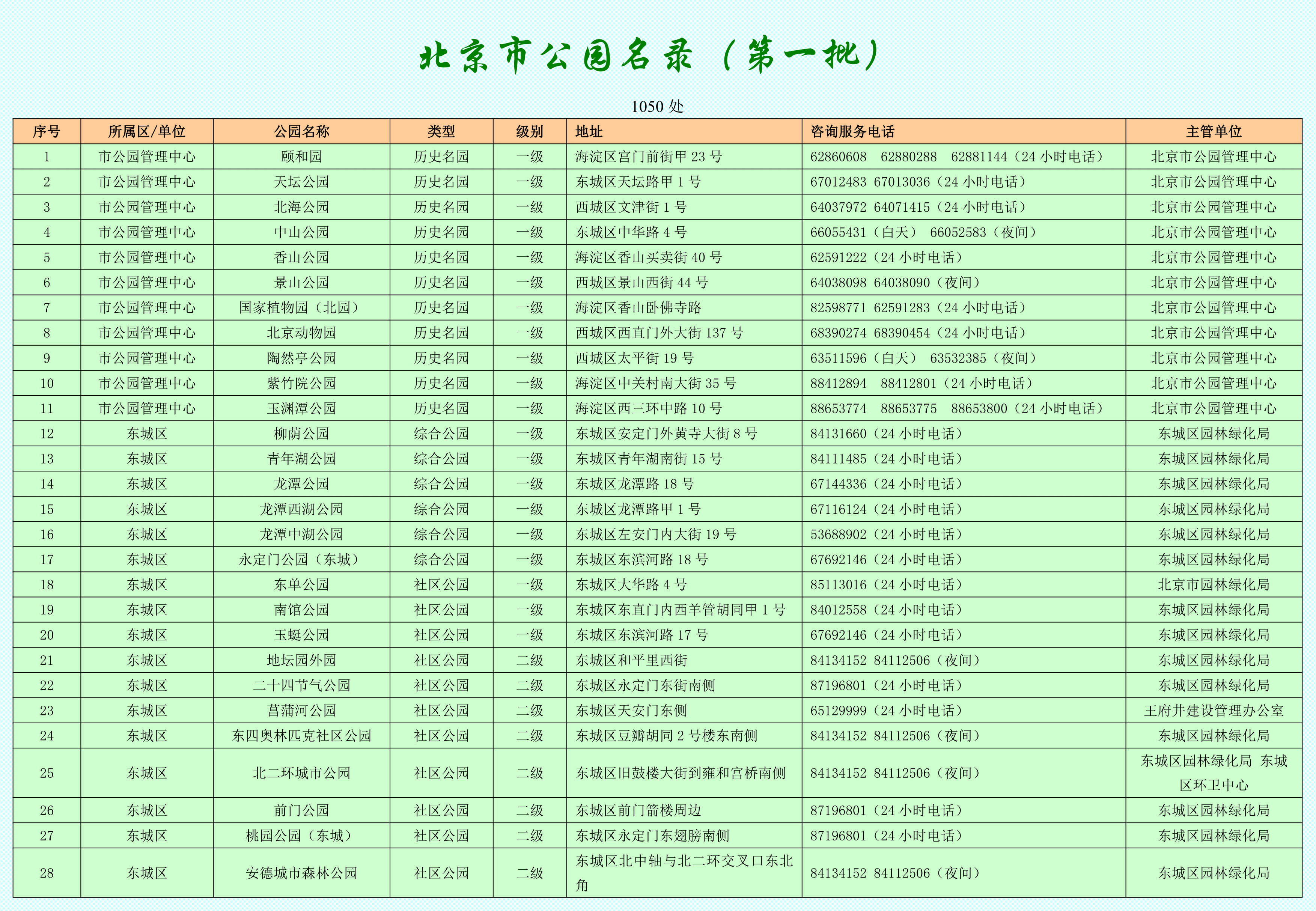 1.頤和園2.天壇公園3.北海公園4.中山公園5.香山公園6.景山公園7.國(guó)家植物園(北園)8.北京動(dòng)物園9.陶然亭公園10.紫竹院公園11.玉淵潭公園12.柳蔭公園13.青年湖公園14.龍?zhí)豆珗@15.龍?zhí)段骱珗@16.龍?zhí)吨泻珗@17.永定門公園(東城)18.東單公園19.南館公園20.玉蜓公園21.地壇園外園22.二十四節(jié)氣公園23.菖蒲河公園24.東四奧林匹克社區(qū)公園25.北二環(huán)城市公園26.前門公園27.桃園公園(東城)28.安德城市森林公園29.西革新里城市休閑公園30.燕墩公園31.新中街城市森林公園32.大通濱河公園33.環(huán)二環(huán)城市綠道社區(qū)公園34.環(huán)二環(huán)城市綠廊社區(qū)公園35.玉河公園36.明城墻遺址社區(qū)公園37.建國(guó)門西北角社區(qū)公園38.亮馬河公園39.松林里公園40.北京市勞動(dòng)人民文化宮41.地壇公園42.北京明城墻遺址公園43.皇城根遺址公園44.燕墩遺址游園45.蟠桃宮游園46.廣渠秋韻游園47.景泰公園48.清水苑小游園49.安貞橋西南角小游園50.校尉胡同小游園51.四塊玉游園52.前門東大街街心花園53.正義路小游園54.朝陽(yáng)門橋西北側(cè)小游園55.華城公園56.自然博物館公園57.龍?zhí)稏|路游園58.左安西里游園59.東直門橋西北側(cè)小游園60.東四十條橋西北側(cè)小游園61.朝陽(yáng)門橋西南側(cè)小游園62.天安門東南角小游園63.中軸路小游園64.建國(guó)門健身樂(lè)園65.萬(wàn)國(guó)公寓小游園66.燈市口小游園67.農(nóng)總行小游園68.工體小游園69.同仁小游園70.都市馨園休閑廣場(chǎng)71.珠市口東大街休閑廣場(chǎng)72.前門東路北部花園73.廣渠春曉游園74.領(lǐng)行國(guó)際游園75.華城小游園76.四塊玉小游園77.天壇西小游園78.祈年大街小游園79.金魚池小游園80.天壇北路街心花園81.同心園(東城)82.廣渠門小游園83.檢察院外側(cè)小游園84.壩橋金色小游園85.金中都公園86.永定門公園(西城)87.宣武藝園88.白云公園89.北濱河公園90.雙秀公園91.人定湖公園92.萬(wàn)壽公園93.順城公園94.長(zhǎng)椿苑公園95.蓮花河城市休閑公園96.北京濱河公園97.翠芳園98.南禮士路公園99.德勝公園100.玫瑰公園101.官園公園102.金融街中心公園103.廣寧公園104.德勝苑105.北展后湖社區(qū)公園106.小馬廠社區(qū)公園107.潭西勝境公園108.珠市口西大街社區(qū)公園109.逸駿園110.天橋南大街游園111.月壇公園112.什剎海公園113.北京大觀園114.西便門城墻遺址公園115.北營(yíng)房城市森林公園116.新街口城市森林公園117.逸清園城市森林公園118.常樂(lè)坊城市森林公園119.廣陽(yáng)谷城市森林公園120.地安門內(nèi)大街游園121.茶馬街游園122.天寧寺休閑游園123.虎坊路游園124.先農(nóng)壇神倉(cāng)游園125.手帕口橋南游園126.紅山游園127.薊丘游園128.大紅羅游園129.東福壽里游園130.平安里游園131.復(fù)興門橋西北角游園132.白云觀游園133.都城隍廟游園134.人定湖北巷游園135.教場(chǎng)口街游園136.西章胡同游園137.東光胡同游園138.西直門內(nèi)大街游園139.建成園140.五棟大樓游園141.車公莊大街游園142.龍頭井游園143.北大醫(yī)院游園144.廣順苑145.白紙坊西街游園146.右安聞鶯游園147.教子胡同游園148.天寧塔影游園149.廣外灣子路口游園150.京韻園151.棉花片游園152.蠟燭園153.月亮灣公園154.百花園155.和平門游園156.南線閣街游園157.復(fù)興門游園158.南新華街游園159.牛街游園160.二里溝游園161.東官房游園162.南堂游園163.南禮士路游園164.黃寺大街游園165.白廣路游園166.右內(nèi)大街游園167.先農(nóng)壇西路游園168.青年游園169.沈家本故居游園170.景山游園171.奧林匹克森林公園172.朝陽(yáng)公園173.慶豐公園174.大望京公園175.團(tuán)結(jié)湖公園176.朝陽(yáng)區(qū)紅領(lǐng)巾公園177.四得公園178.北小河公園179.望和公園180.興隆公園181.古塔公園182.將府郊野公園(一至三期)183.將府公園(四期)184.溫榆河公園(朝陽(yáng))185.望湖公園186.立水橋公園187.東一處公園188.潤(rùn)澤公園189.萬(wàn)和桐城公園190.望承公園191.太陽(yáng)宮花園192.仰山公園193.兒童主題公園194.華匯紫薇公園195.瑞竹園196.百子灣公園197.望京SOHO和趣園198.十友園199.麗都公園200.金隅南湖公園201.望京體育公園202.弘善城市休閑公園203.常營(yíng)保利公園204.翠城公園205.壩河休閑公園206.暖山生態(tài)公園207.日壇公園208.元大都城垣(土城)遺址公園(朝陽(yáng)段)209.京城森林郊野公園210.小武基公園211.朝來(lái)森林公園(三期)212.官莊公園213.東風(fēng)公園214.鴻博郊野公園215.鎮(zhèn)海寺郊野公園216.勇士營(yíng)郊野公園217.京城槐園郊野公園218.平房公園219.白鹿郊野公園220.京城梨園郊野公園221.東壩郊野公園222.常營(yíng)公園223.朝來(lái)森林公園224.金田郊野公園225.太陽(yáng)宮公園226.老君堂郊野公園227.海棠郊野公園228.清河營(yíng)郊野公園229.黃草灣郊野公園230.杜仲公園231.京城體育郊野公園232.百花郊野公園233.太陽(yáng)宮體育休閑公園234.八里橋公園235.華茂綠線休閑園236.大屯陽(yáng)光休閑園237.昆泰休閑公園238.小紅門芳林園239.會(huì)議中心休閑園240.家樂(lè)福休閑園241.勁松百環(huán)休閑園242.利星行休閑園243.綠影園244.丁香園245.裘馬都休閑園246.左家莊科普廉政文化園247.首城國(guó)際休閑園248.小關(guān)奧林匹克文化游園249.紫檀休閑園250.百花深處小游園251.何里棲地公園252.四合公園253.孫河郊野公園254.馬家灣濕地公園255
