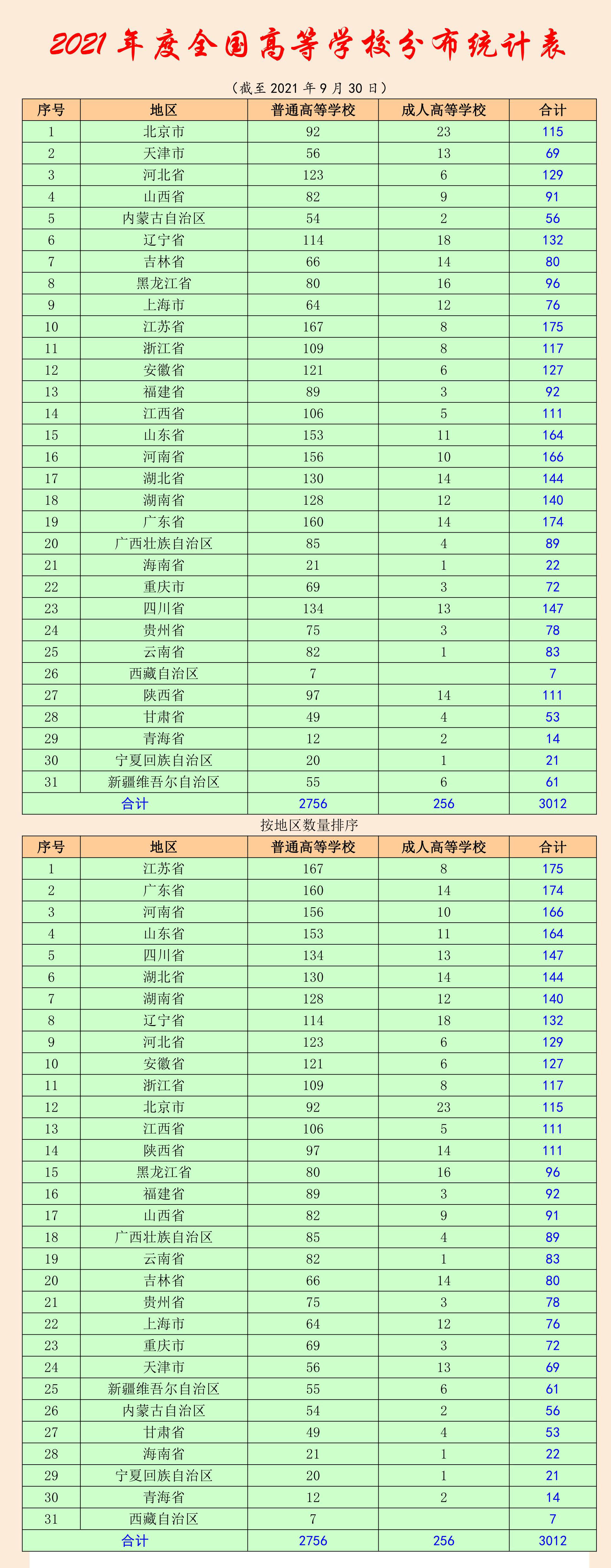 截至2023年6月15日,全國高等學(xué)校共計(jì)3072所,其中:普通高等學(xué)校2820所,含本科院校1275所、高職(??疲┰盒?545所;成人高等學(xué)校252所。本名單未包含港澳臺(tái)地區(qū)高等學(xué)校。