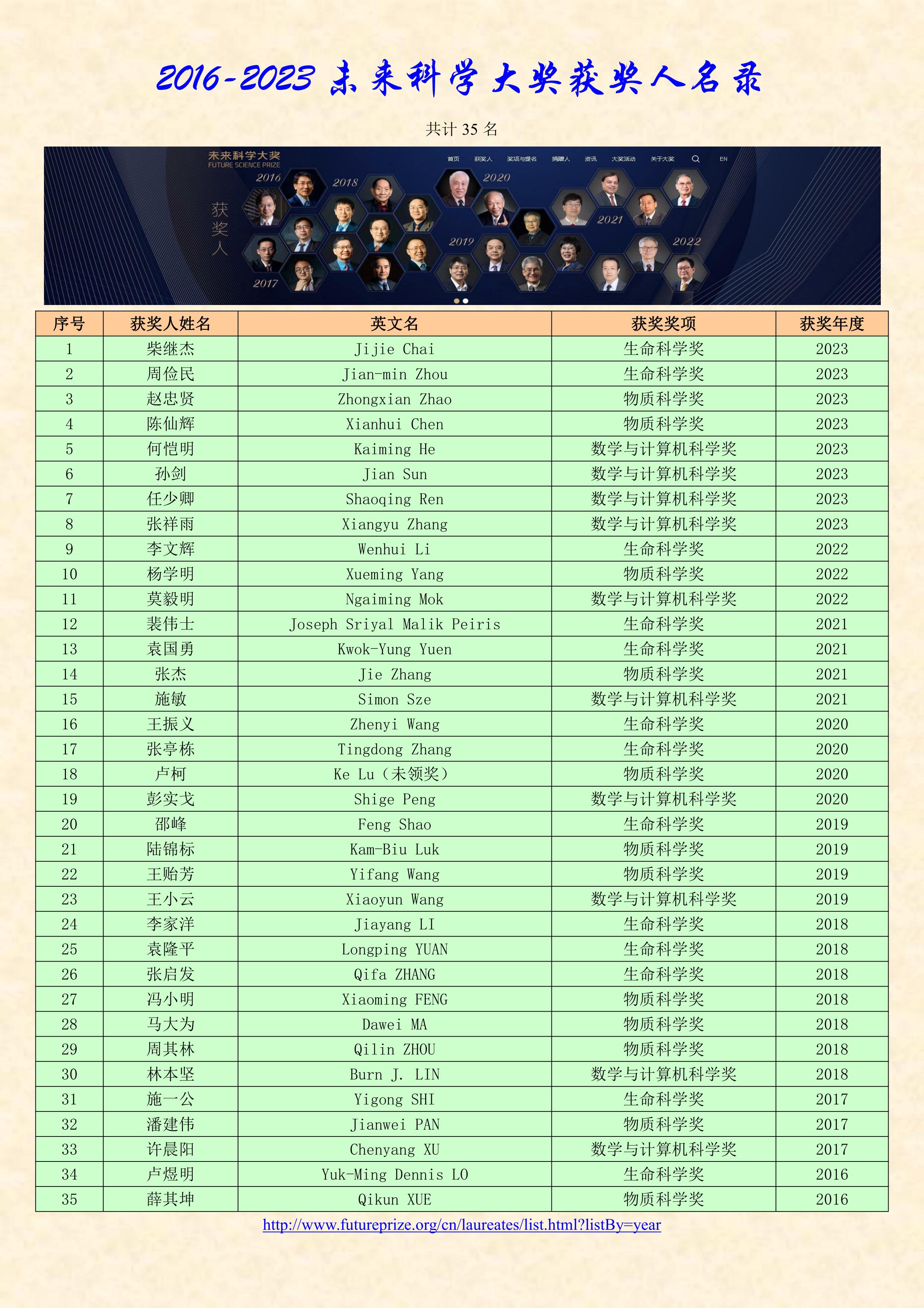 2016-2023未來科學(xué)大獎(jiǎng)獲獎(jiǎng)人名錄