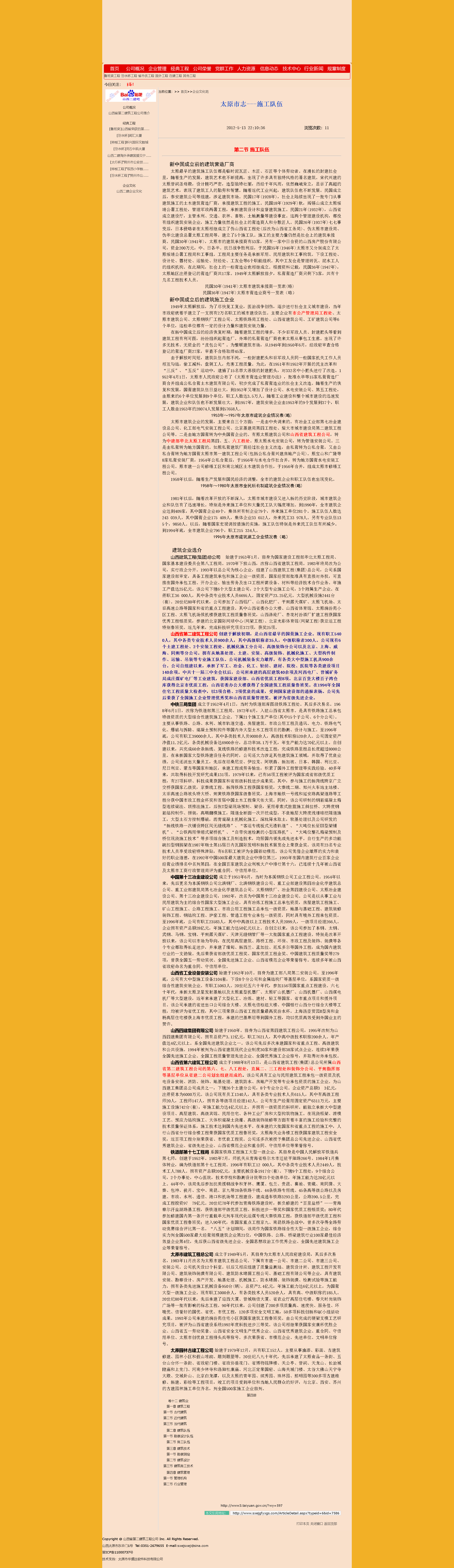 太原市建筑工程總公司 成立于1949年5月,其前身為太原市人民政府建設(shè)局,其后多次易名,1983年11月改名為太原市建筑工程總公司。下屬有市建一公司、市建二公司、市建三公司、安裝公司。公司機關(guān)設(shè)12個科室。以后又相應(yīng)組建了質(zhì)量監(jiān)測站、建筑設(shè)計所、建筑工程開發(fā)有限公司、建筑裝飾裝潢有限公司、建筑防水堵漏工程公司、基礎(chǔ)工程有限公司等企業(yè),具有建筑安裝、勘察設(shè)計、房產(chǎn)開發(fā)、地基處理、機械施工、防水堵漏、裝飾裝潢、檢測試驗等施工能力,擁有各類先進施工機械設(shè)備950臺(輛),總資產(chǎn)2.4億元,年施工能力達6億元以上,為國營大型一級施工企業(yè)?,F(xiàn)有職工3000余人,有各類技術(shù)人員520余人,具有高、中級職稱的185人。20世紀80年代以來,先后承建了迎西大廈、晉城瑞信大廈、省農(nóng)業(yè)廳高層住宅樓、春天時尚裝飾廣場等一批有影響的標(biāo)志工程。90年代以來,公司創(chuàng)建了200多項質(zhì)量高、速度快、服務(wù)佳、環(huán)境優(yōu)、信譽好的國優(yōu)、省優(yōu)、市優(yōu)工程,120多項安全文明工地,50多項科技創(chuàng)新和QC小組活動成果。1993年公司承建的漪汾苑住宅小區(qū)獲國家建筑工程魯班獎。由公司完成的硬架支模工藝研究項目,被評為山西省建設(shè)系統(tǒng)1992年度科技進步三等獎。該公司相繼榮獲國家安康杯優(yōu)勝企業(yè)、山西省五一勞動獎?wù)隆⑸轿魇“踩拿魃a(chǎn)優(yōu)秀企業(yè)、山西省優(yōu)秀建筑企業(yè)、重合同、守信用單位、太原市創(chuàng)優(yōu)良工程排頭兵等稱號。多次榮獲省、市模范企業(yè)、先進單位、文明單位稱號。