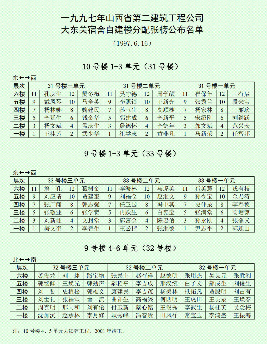 回到主題,下面是省建二公司上世紀末,最后一次福利分房,當時每平米價格是408元。找到山西二建、山西四建的資料后,捎帶看到這份分房榜。一下子又把我?guī)Щ?997年,那次張榜公布最后定案的名單。那時候,這可是公司所有職工盼望已久,翹首以待的結果,真是有人歡喜有人愁啊!看到了嗎,我分到的房子,可以說是上上等,無論從位置、層次、光照、朝向看,都無話可說,那是上上下下幾千人都日思夜想的愿望??!之前,我并沒有因為個人利益找過任何公司領導,倒是主管分房的領導專門到科里征求我的意見,看上哪套要哪套,其他人不征求個人意見,只對科長你例外!我攜了妻子、兒子去自建樓實地考察。六層磚混結構樓,按說三層為佳,可是由于樓間距問題,四層光照更好一些,這對妻子的關節(jié)炎有好處。一家人充分協(xié)商,最后確定了中間單元四層左戶?;毓荆簿痛騻€電話告知分房領導?,F(xiàn)在回想起來,當時確實欠妥,看把你了不得的,你的架子也忒大了吧!連一句感謝的話都舍不得說,別人把分房領導的門都踏破了,使出渾身解數(shù),哭的、鬧的、軟硬兼施,最后還是不能如愿,甚至記恨一輩子!