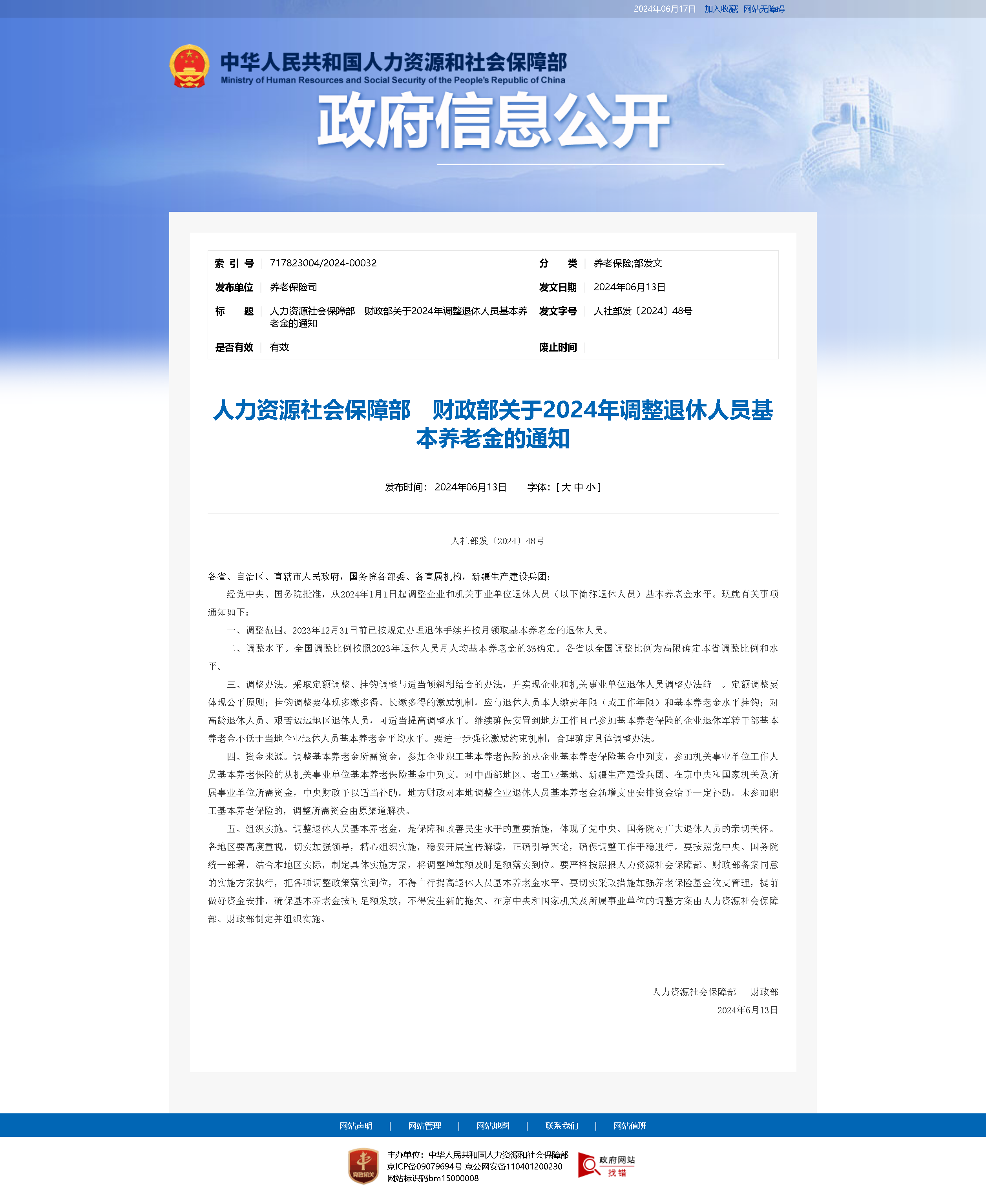 人力資源社會(huì)保障部 財(cái)政部關(guān)于2023年調(diào)整退休人員基本養(yǎng)老金的通知