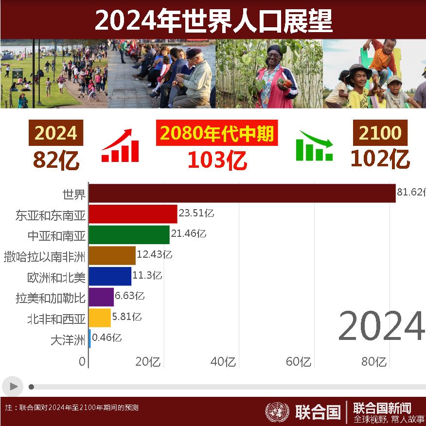 新華社聯(lián)合國7月11日電(記者王建剛)聯(lián)合國11日發(fā)布的《2024年世界人口展望:結(jié)果摘要》報告顯示,預計世界人口將在本世紀80年代中期達到約103億的峰值,到本世紀末回落至約102億。
