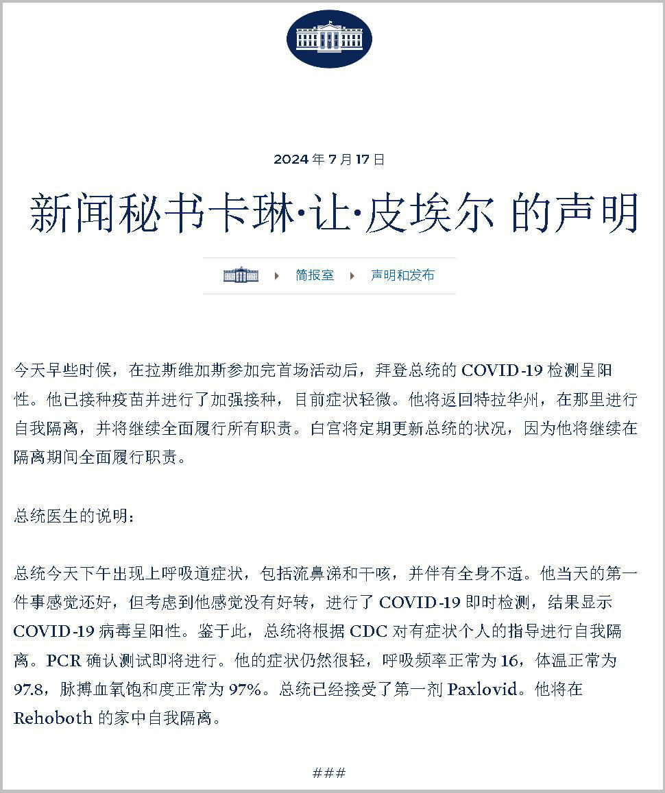 白宮醫(yī)生透露,拜登當(dāng)天下午出現(xiàn)上呼吸道癥狀,包括流鼻涕、干咳和身體不適,目前“癥狀輕微”,他的呼吸頻率、體溫和血氧都正常,現(xiàn)已接受藥物治療。