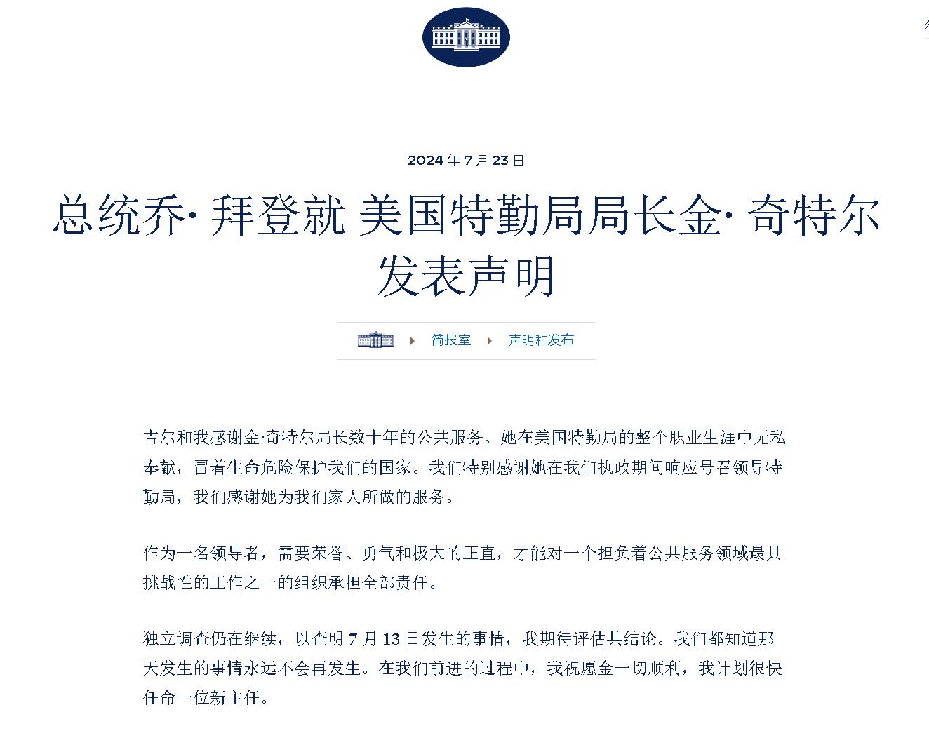 美國(guó)總統(tǒng)拜登23日發(fā)表聲明,感謝奇特爾在職期間為國(guó)家作出的貢獻(xiàn),并表示“未遂刺殺”事件獨(dú)立審查工作仍在繼續(xù),他將很快任命新的特勤局局長(zhǎng)。美國(guó)國(guó)土安全部長(zhǎng)馬約卡斯隨后在一份聲明中宣布,特勤局副局長(zhǎng)羅納德·羅已被任命為特勤局代理局長(zhǎng)。