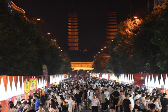 2024年7月16日,山西太原,雙塔寺前人山人海。豐富多彩的夜間主題活動(dòng),滿足人們舒適納涼的需求,進(jìn)一步催熱“夏日夜經(jīng)濟(jì)”。視覺(jué)中國(guó) 資料圖