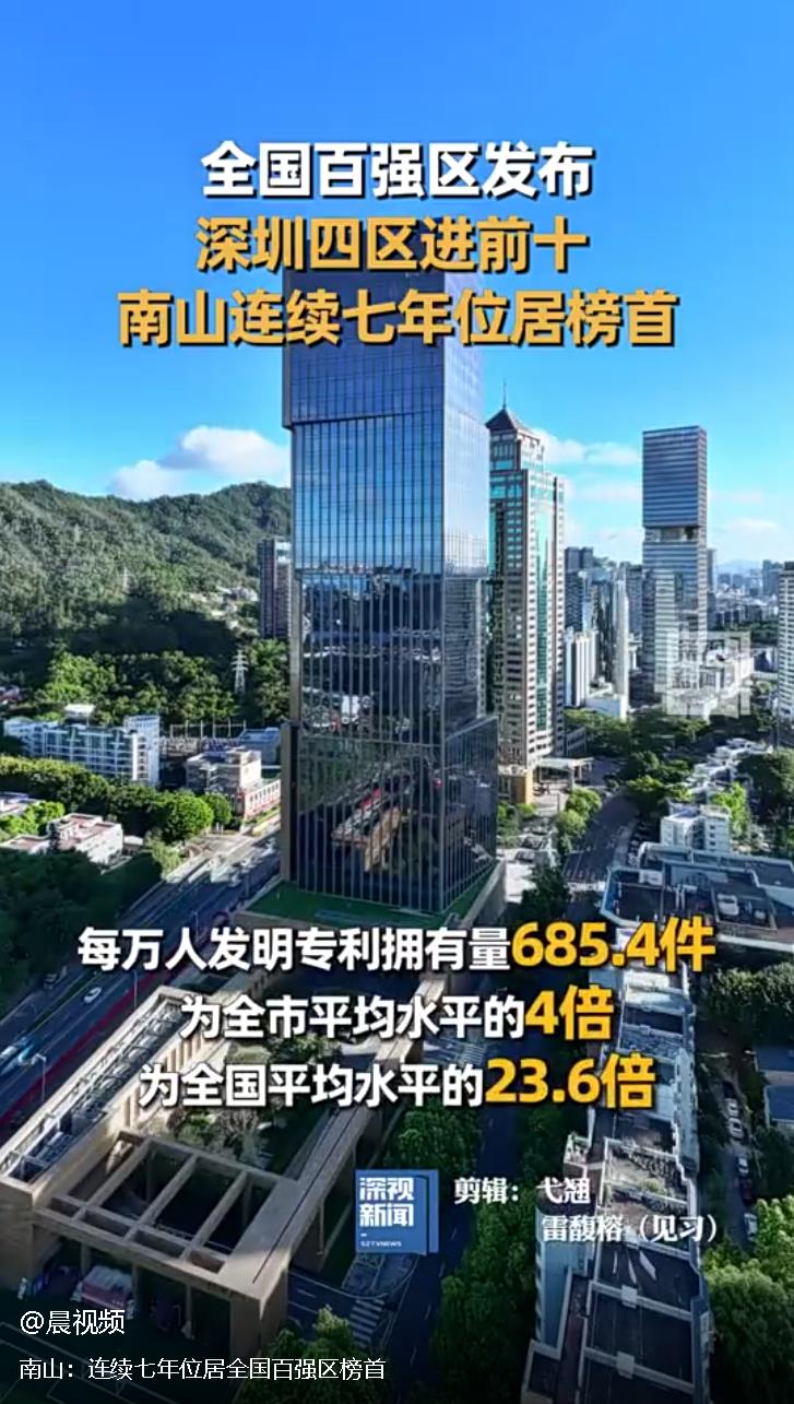 8月2日,賽迪顧問城市經(jīng)濟(jì)研究中心發(fā)布“2024賽迪百強(qiáng)區(qū)”榜單,深圳南山區(qū)排名第一,這也是南山區(qū)連續(xù)7年位居全國百強(qiáng)區(qū)榜首。