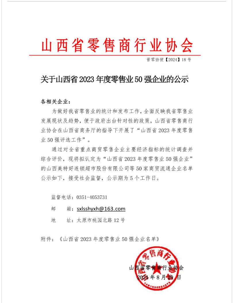 通過對全省重點商貿(mào)零售企業(yè)主要經(jīng)濟指標(biāo)的統(tǒng)計調(diào)查并綜合評價,現(xiàn)將擬認(rèn)定為“山西省2023年度零售業(yè)50強企業(yè)”的山西美特好連鎖超市股份有限公司等50家商貿(mào)流通企業(yè)名單公示如下,接受社會監(jiān)督,公示期為5個工作日。美特好以85.9165億雄踞榜首。