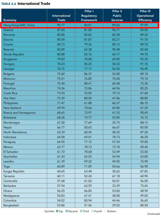 報告屬試行性質(zhì),以十項指標(biāo)及三個維度比較各個經(jīng)濟體在營商環(huán)境方面的整體表現(xiàn)。在十項指標(biāo)當(dāng)中,香港獲最高分?jǐn)?shù)的三項分別是“國際貿(mào)易”(90.77分)、“市場準(zhǔn)入”(85.49分)及“市政公用基礎(chǔ)設(shè)施服務(wù)”(77.71分)。在三個維度當(dāng)中,香港在“辦事效率”維度的總體得分是78.52,排名第五。