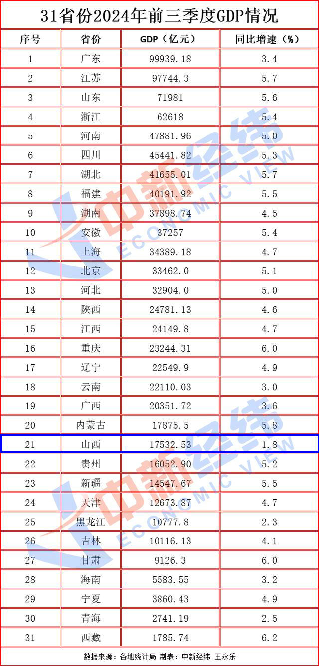 中新經(jīng)緯10月31日電 (王永樂(lè))隨著黑龍江、山西、青海10月30日公布經(jīng)濟(jì)“成績(jī)單”,31省份2024年前三季度地區(qū)生產(chǎn)總值(GDP)數(shù)據(jù)全部出爐。從總量來(lái)看,廣東、江蘇進(jìn)入“9萬(wàn)億俱樂(lè)部”;從增速來(lái)看,18省份高于“全國(guó)線”,西藏增速居首。