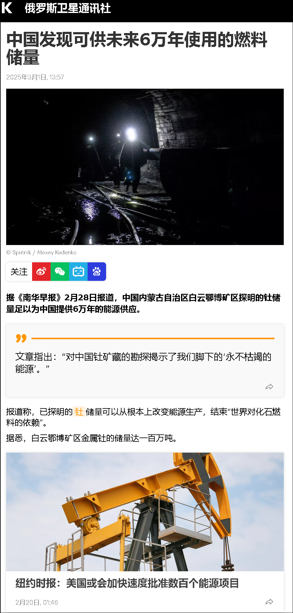 文章指出:“對(duì)中國(guó)釷礦藏的勘探揭示了我們腳下的‘永不枯竭的能源’?!?