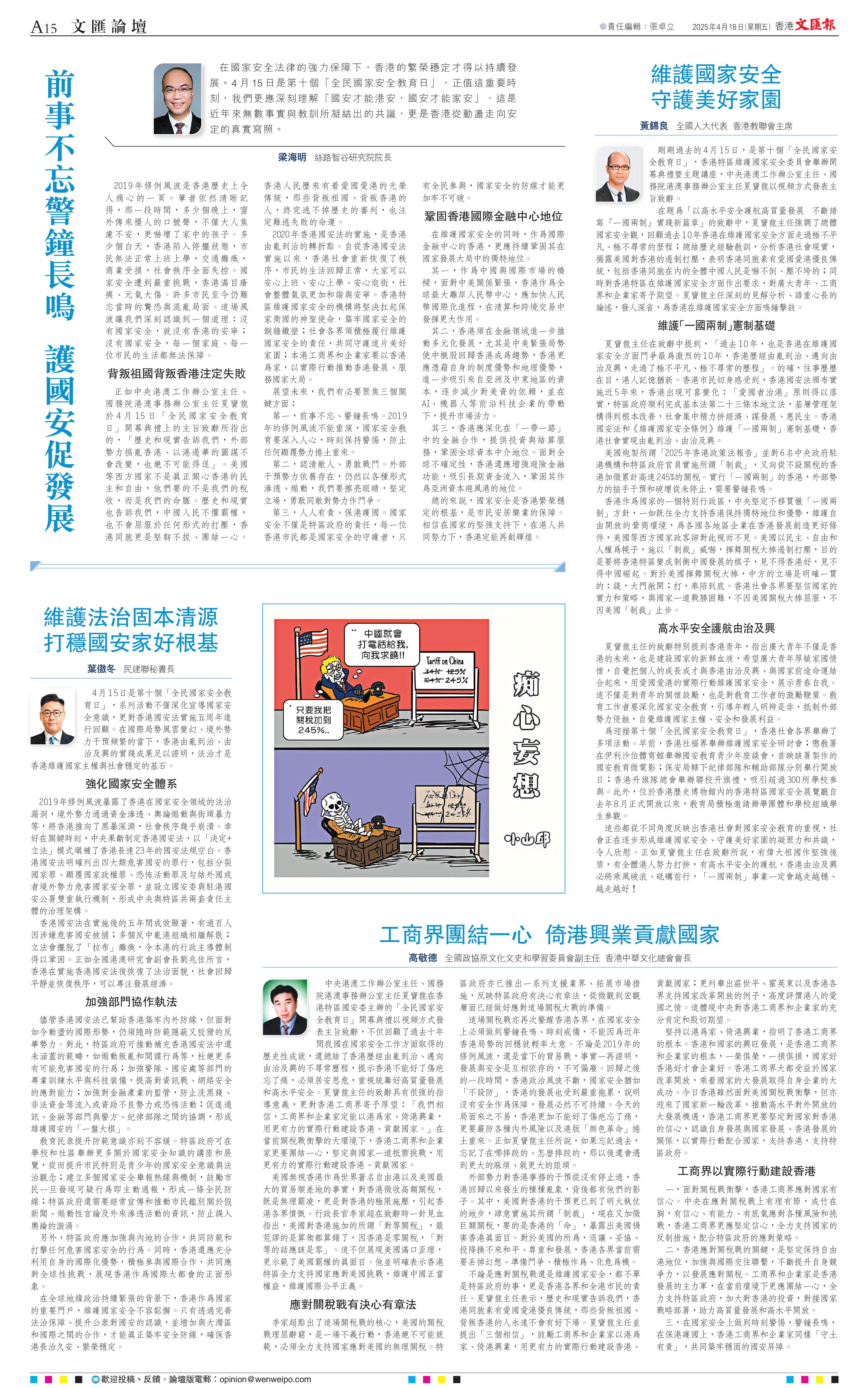 中央港澳工作辦公室主任、國(guó)務(wù)院港澳事務(wù)辦公室主任夏寶龍?jiān)谙愀厶貐^(qū)國(guó)安委主辦的「全民國(guó)家安全教育日」開(kāi)幕典禮以視頻方式發(fā)表主旨致辭,不但回顧了過(guò)去十年間我國(guó)在國(guó)家安全工作方面取得的歷史性成就,還總結(jié)了香港歷經(jīng)由亂到治、邁向由治及興的不尋常歷程,提示香港不能好了傷疤忘了痛,必須居安思危,重視統(tǒng)籌好高質(zhì)量發(fā)展和高水平安全。夏寶龍主任的致辭具有很強(qiáng)的指導(dǎo)意義,更對(duì)香港工商界寄予厚望:「我們相信,工商界和企業(yè)家定能以港為家、倚港興業(yè),用更有力的實(shí)際行動(dòng)建設(shè)香港、貢獻(xiàn)國(guó)家。」在當(dāng)前關(guān)稅戰(zhàn)沖擊的大環(huán)境下,香港工商界和企業(yè)家更要團(tuán)結(jié)一心,堅(jiān)定與國(guó)家一道抵御挑戰(zhàn),用更有力的實(shí)際行動(dòng)建設(shè)香港、貢獻(xiàn)國(guó)家。