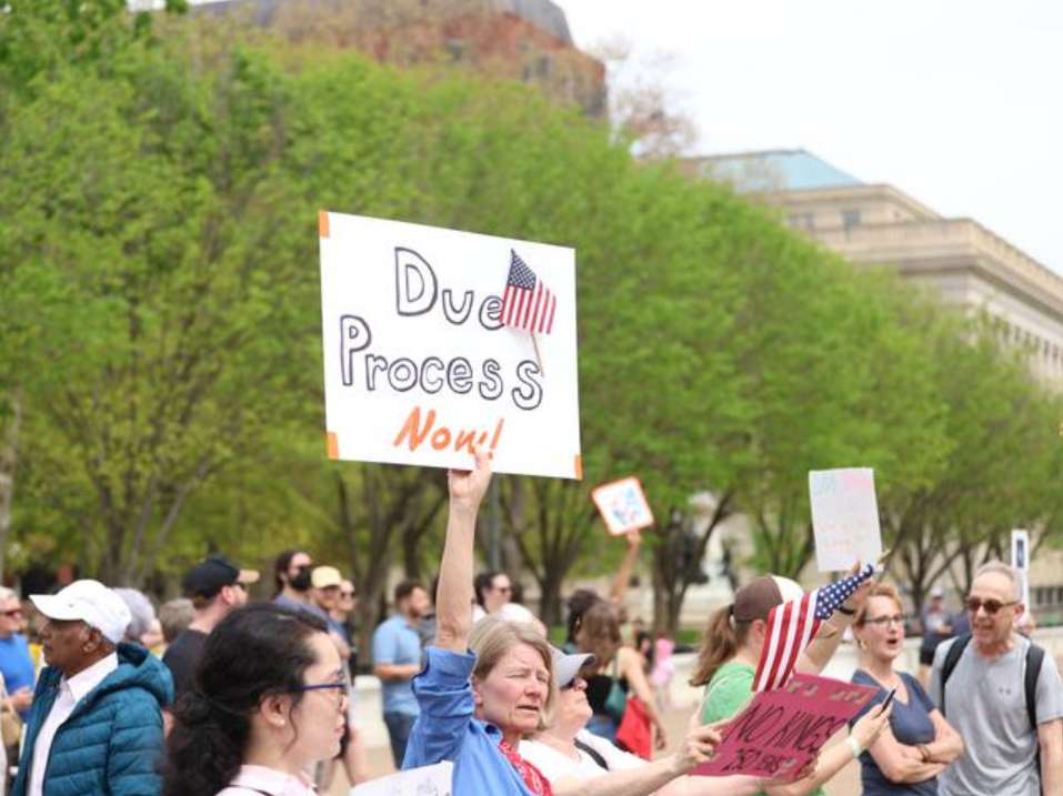 記者現(xiàn)場采訪、觀察發(fā)現(xiàn),抗議者除了對具體政策表達不滿,更深層的擔憂在于制度受到破壞以及憲法面臨危機。不少標語牌都包含“正當程序”“憲法危機”“恢復民主”等關(guān)鍵詞,體現(xiàn)了民眾對美國民主與法治的深切憂慮。