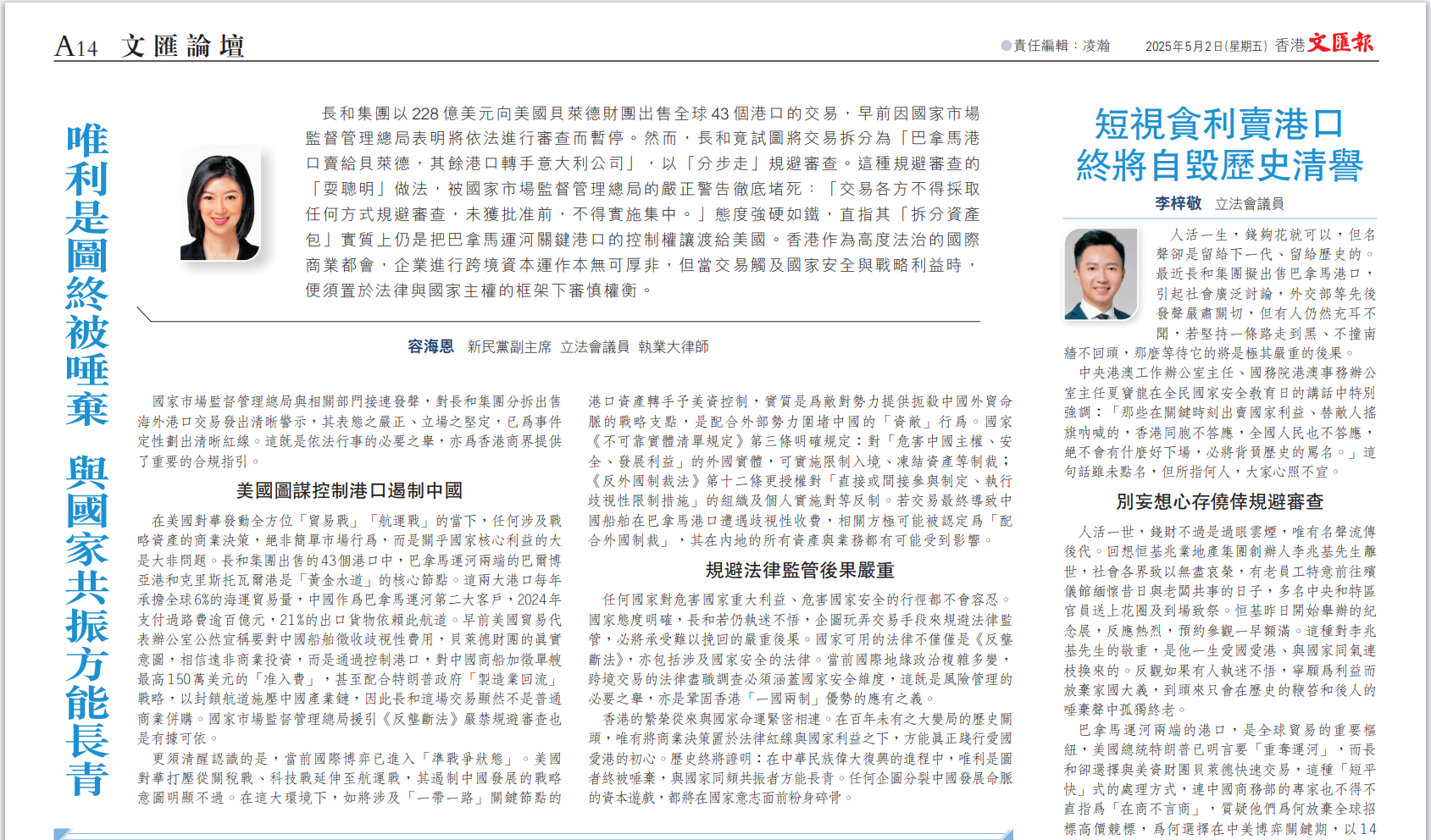 任何國家對危害國家重大利益、危害國家安全的行徑都不會容忍。國家態(tài)度明確,長和若仍執(zhí)迷不悟,企圖玩弄交易手段來規(guī)避法律監(jiān)管,必將承受難以挽回的嚴(yán)重后果。國家可用的法律不僅僅是《反壟斷法》,亦包括涉及國家安全的法律。當(dāng)前國際地緣政治復(fù)雜多變,跨境交易的法律盡職調(diào)查必須涵蓋國家安全維度,這既是風(fēng)險管理的必要之舉,亦是鞏固香港「一國兩制」優(yōu)勢的應(yīng)有之義。
