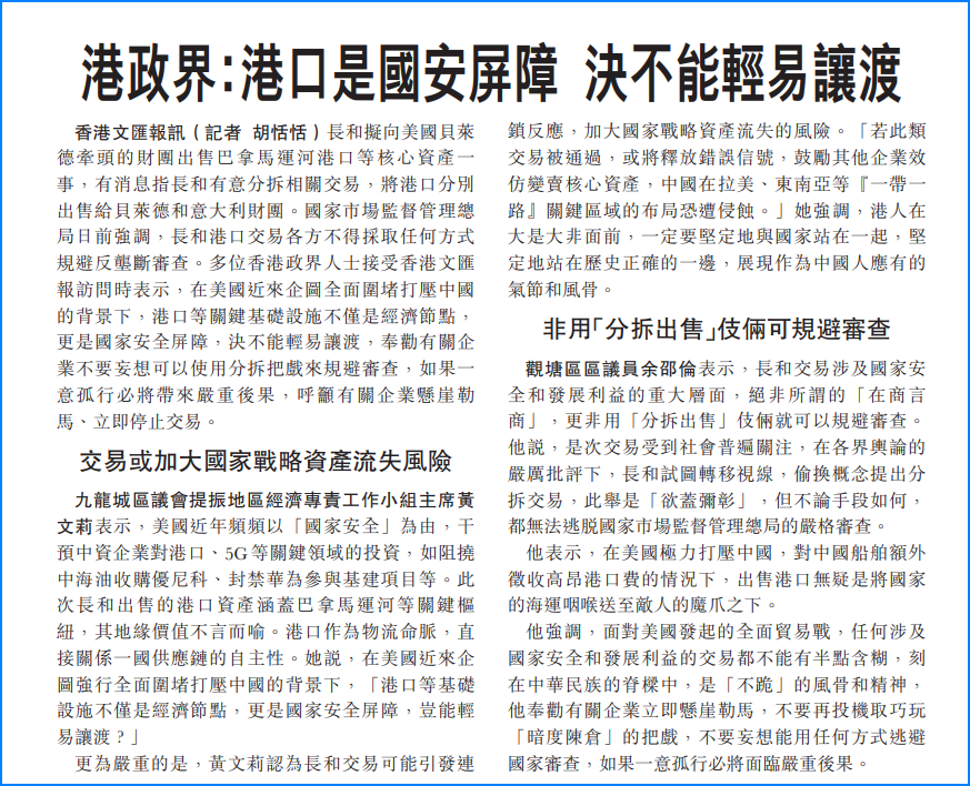 觀塘區(qū)區(qū)議員余邵倫表示,長(zhǎng)和交易涉及國(guó)家安全和發(fā)展利益的重大層面,絕非所謂的「在商言商」,更非用「分拆出售」伎倆就可以規(guī)避審查。他說(shuō),是次交易受到社會(huì)普遍關(guān)注,在各界輿論的嚴(yán)厲批評(píng)下,長(zhǎng)和試圖轉(zhuǎn)移視線,偷換概念提出分拆交易,此舉是「欲蓋彌彰」,但不論手段如何,都無(wú)法逃脫國(guó)家市場(chǎng)監(jiān)督管理總局的嚴(yán)格審查。