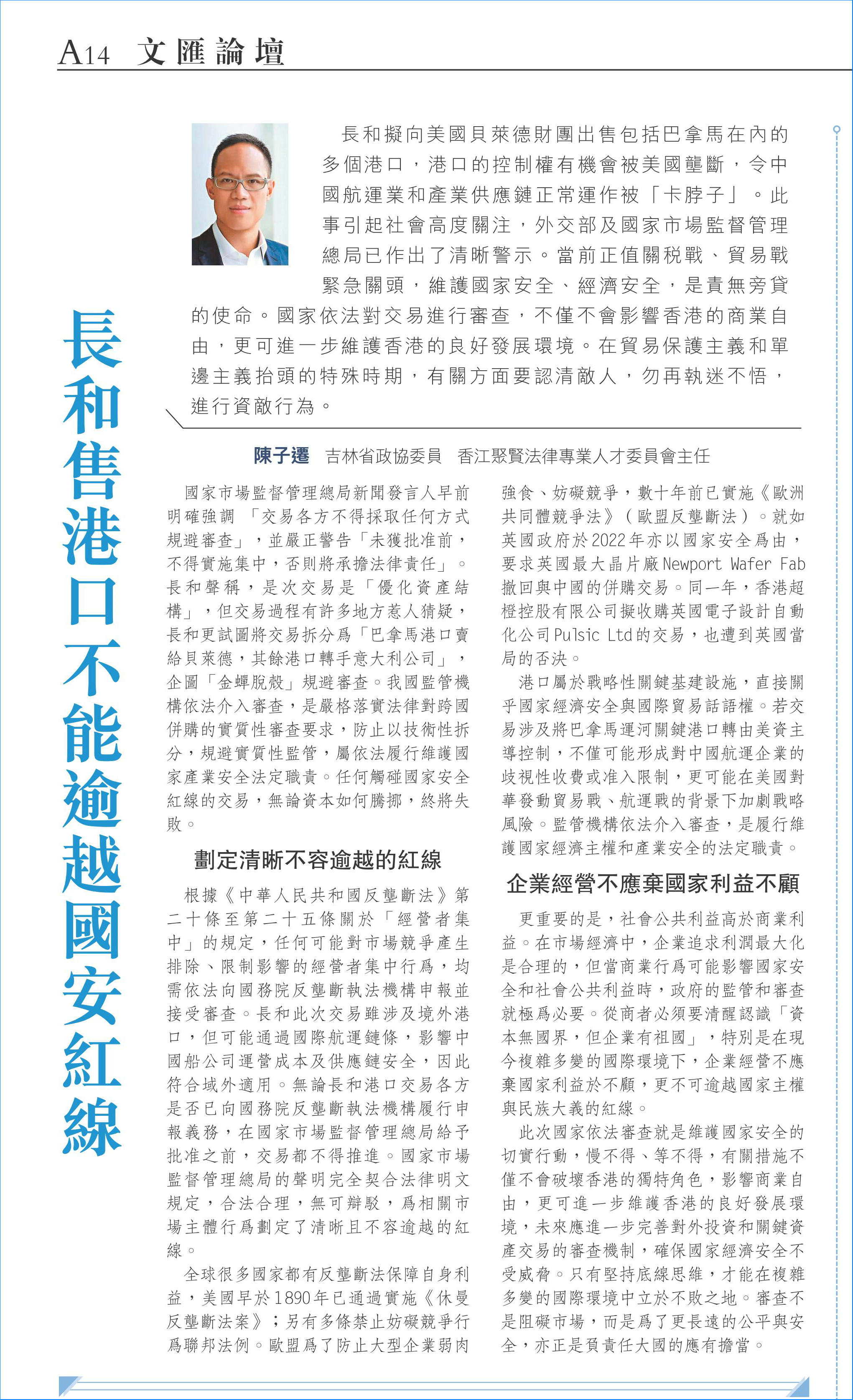 長和擬向美國貝萊德財團(tuán)出售包括巴拿馬在內(nèi)的多個港口,港口的控制權(quán)有機(jī)會被美國壟斷,令中國航運(yùn)業(yè)和產(chǎn)業(yè)供應(yīng)鏈正常運(yùn)作被「卡脖子」。此事引起社會高度關(guān)注,外交部及國家市場監(jiān)督管理總局已作出了清晰警示。當(dāng)前正值關(guān)稅戰(zhàn)、貿(mào)易戰(zhàn)緊急關(guān)頭,維護(hù)國家安全、經(jīng)濟(jì)安全,是責(zé)無旁貸的使命。國家依法對交易進(jìn)行審查,不僅不會影響香港的商業(yè)自由,更可進(jìn)一步維護(hù)香港的良好發(fā)展環(huán)境。在貿(mào)易保護(hù)主義和單邊主義抬頭的特殊時期,有關(guān)方面要認(rèn)清敵人,勿再執(zhí)迷不悟,進(jìn)行資敵行為。