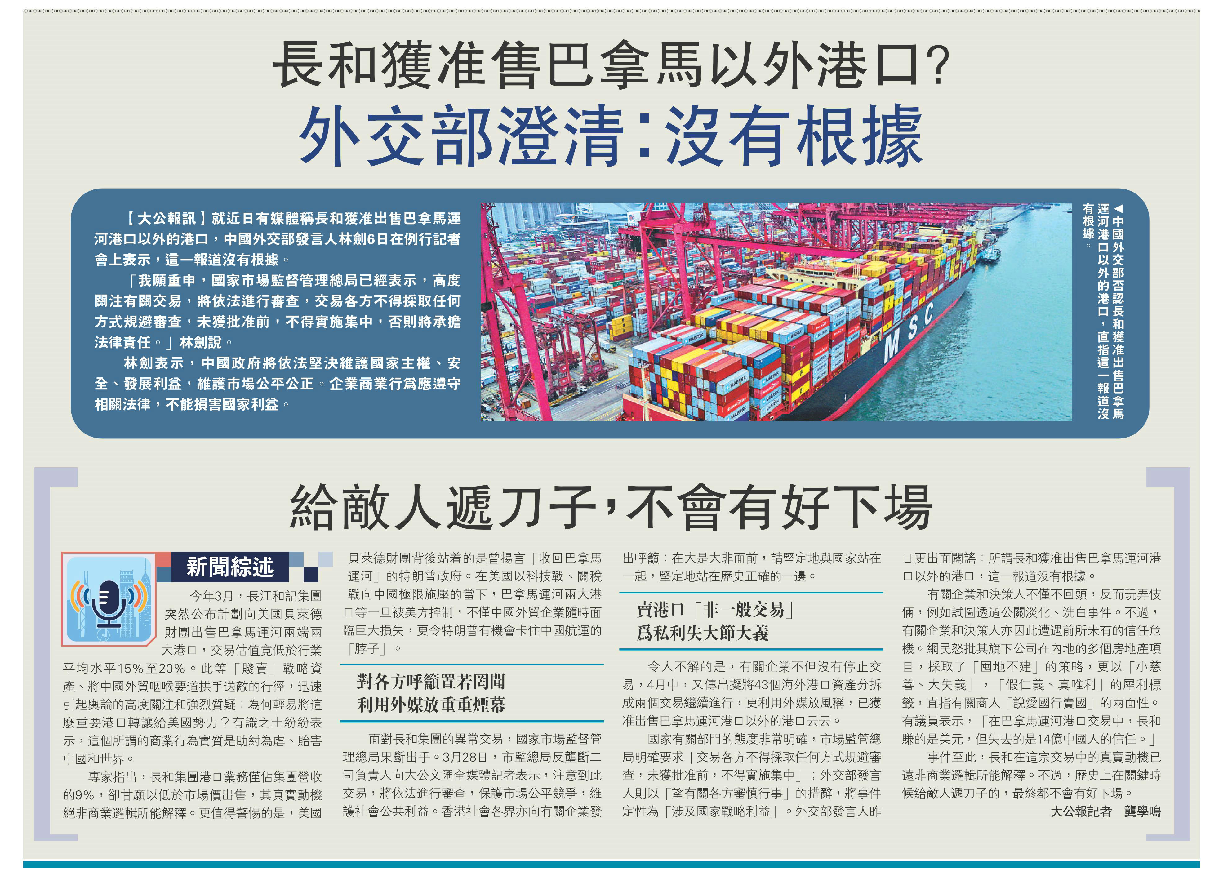 國(guó)家有關(guān)部門的態(tài)度非常明確,市場(chǎng)監(jiān)管總局明確要求「交易各方不得采取任何方式規(guī)避審查,未獲批準(zhǔn)前,不得實(shí)施集中」;外交部發(fā)言人則以「望有關(guān)各方審慎行事」的措辭,將事件定性為「涉及國(guó)家戰(zhàn)略利益」。外交部發(fā)言人昨日更出面辟謠:所謂長(zhǎng)和獲準(zhǔn)出售巴拿馬運(yùn)河港口以外的港口,這一報(bào)道沒有根據(jù)。