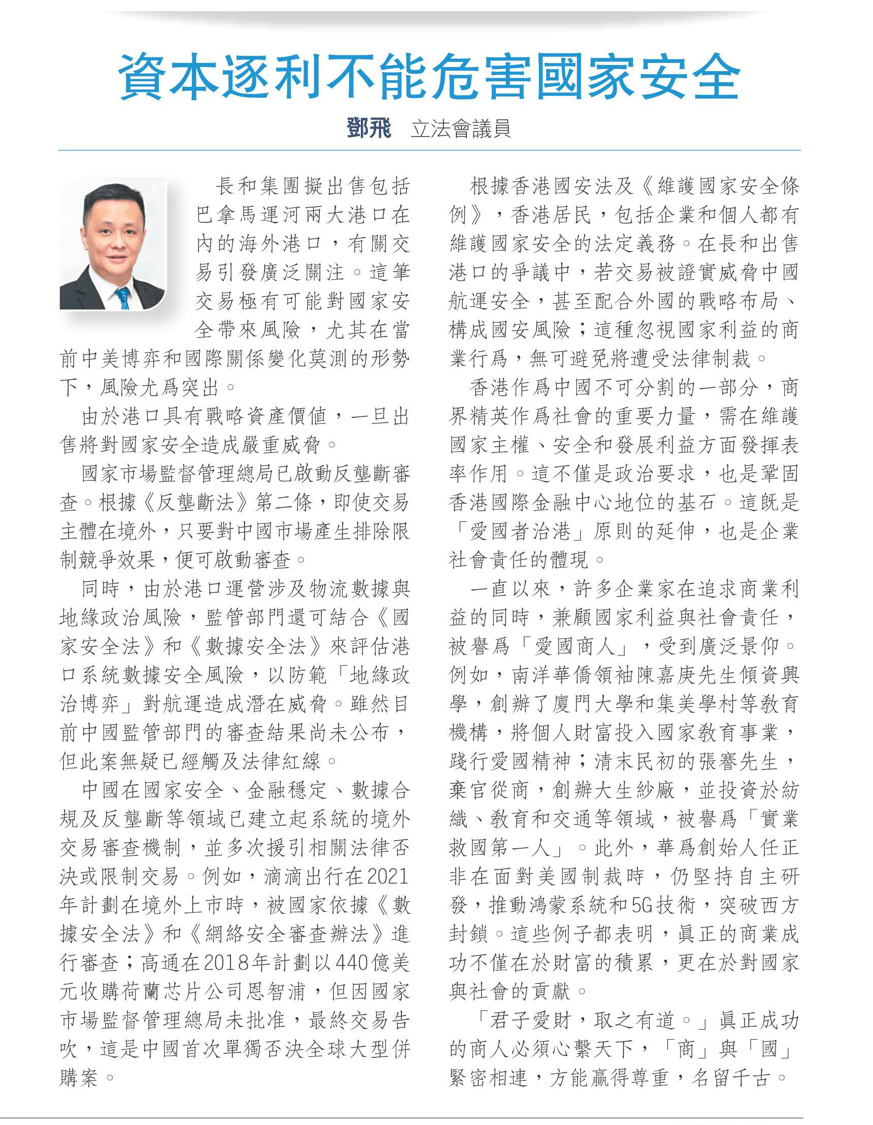根據(jù)香港國安法及《維護國家安全條例》,香港居民,包括企業(yè)和個人都有維護國家安全的法定義務。在長和出售港口的爭議中,若交易被證實威脅中國航運安全,甚至配合外國的戰(zhàn)略布局、構成國安風險;這種忽視國家利益的商業(yè)行為,無可避免將遭受法律制裁。