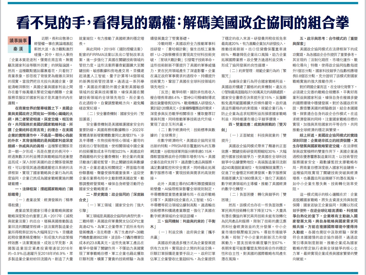綜上所述,美國政企協(xié)同模式的實踐深刻印證:企業(yè)絕非孤立的經(jīng)濟個體,其生存發(fā)展與國家戰(zhàn)略緊密交織。在法律框架與政策杠桿的雙重作用下,美國企業(yè)通過稅收優(yōu)惠響應(yīng)制造業(yè)回流、以技術(shù)管控服務(wù)國家安全、借數(shù)據(jù)監(jiān)控支撐戰(zhàn)略布局,將商業(yè)目標深度嵌入國家利益鏈條。這種協(xié)同既實現(xiàn)了關(guān)鍵技術(shù)突破與經(jīng)濟增長,也暴露出利益捆綁下的潛在風(fēng)險,如中小企業(yè)生態(tài)失衡、技術(shù)轉(zhuǎn)化效率受阻。