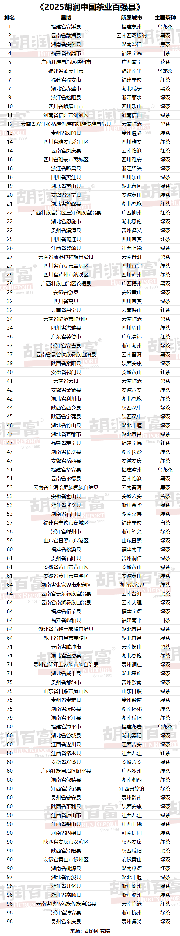 《2025胡潤中國茶業(yè)百強(qiáng)縣》省份分布