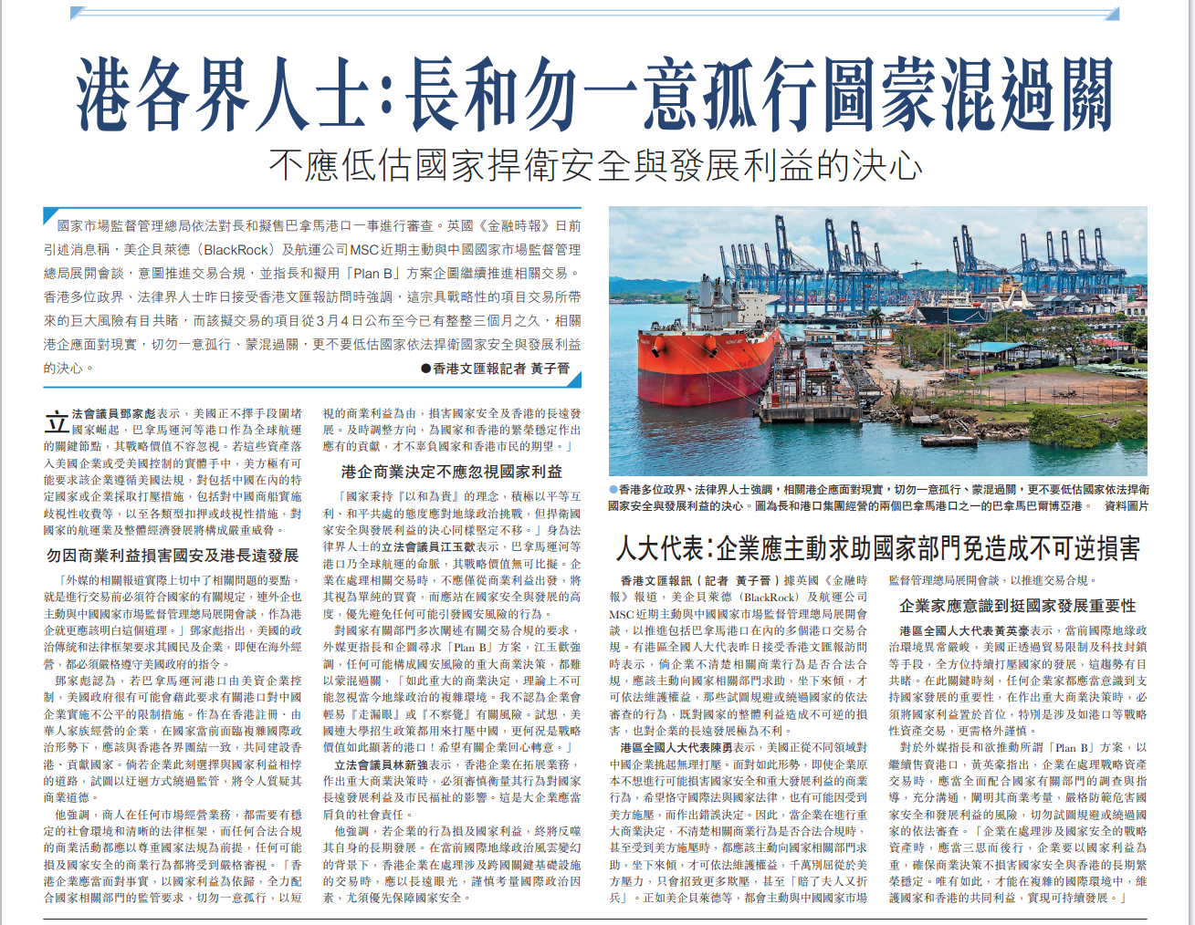 他強調,若企業(yè)的行為損及國家利益,終將反噬其自身的長期發(fā)展。在當前國際地緣政治風云變幻的背景下,香港企業(yè)在處理涉及跨國關鍵基礎設施的交易時,應以長遠眼光,謹慎考量國際政治因素,尤須優(yōu)先保障國家安全。