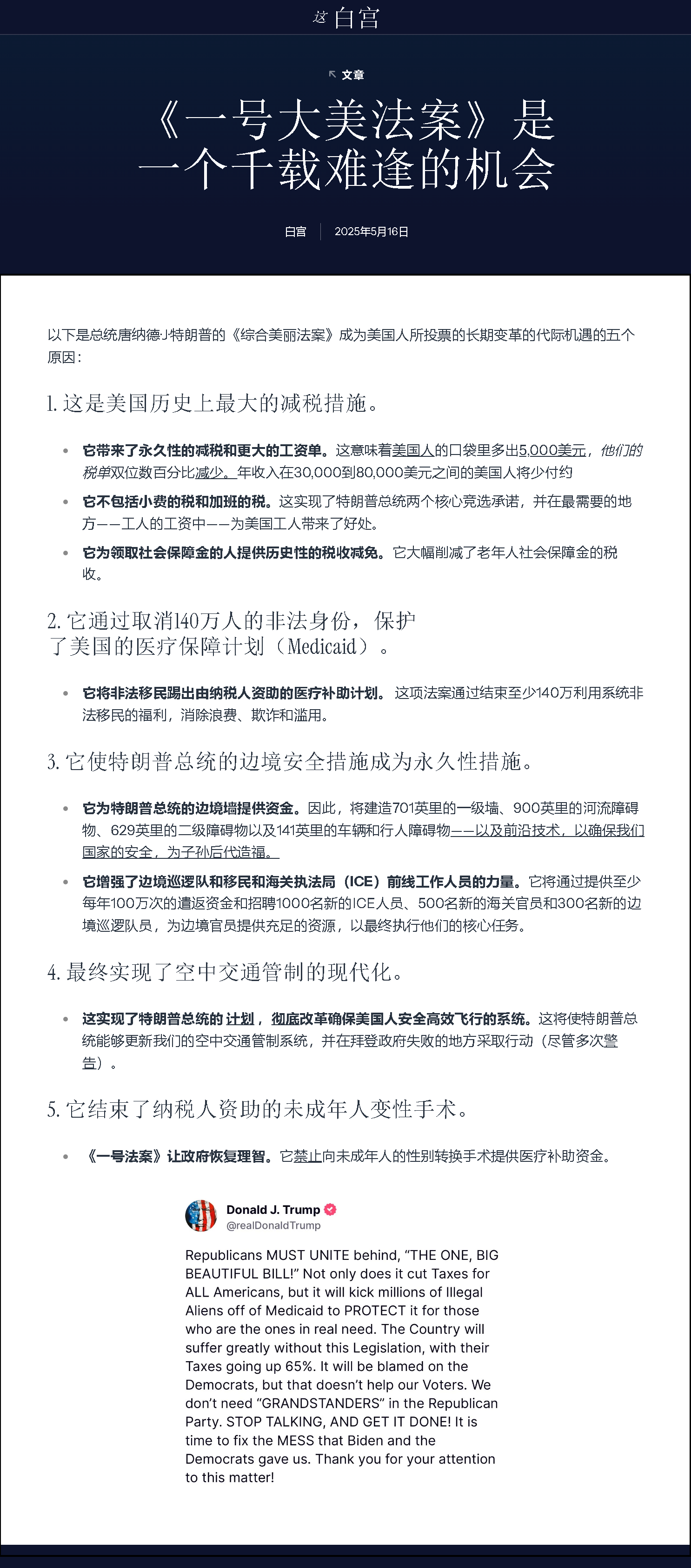 上月,美國共和黨人占據(jù)多數(shù)的國會眾議院以一票優(yōu)勢艱難通過被美國總統(tǒng)特朗普稱為“大而美”的大規(guī)模稅收與支出法案。據(jù)悉,該法案包含多項條款,內(nèi)容超過1000頁,主要側(cè)重于減稅和削減開支。法案將延長特朗普在其第一個總統(tǒng)任期內(nèi)于2017年通過的企業(yè)和個人減稅措施,對小費、汽車貸款等提供新的稅收減免,同時增加國防支出,并為打擊非法移民提供更多資金。