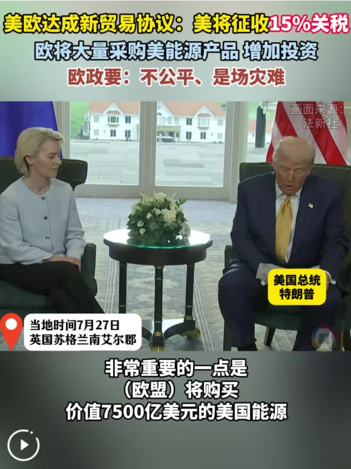 美國(guó)總統(tǒng)特朗普和歐盟委員會(huì)主席馮德萊恩27日在位于英國(guó)蘇格蘭南艾爾郡的特恩貝里高爾夫球場(chǎng)共同宣布,美歐達(dá)成新貿(mào)易協(xié)議,美國(guó)將對(duì)歐盟輸美產(chǎn)品征收15%的關(guān)稅。歐盟將對(duì)美增加6000億美元投資及購(gòu)買價(jià)值7500億美元的美國(guó)能源等。