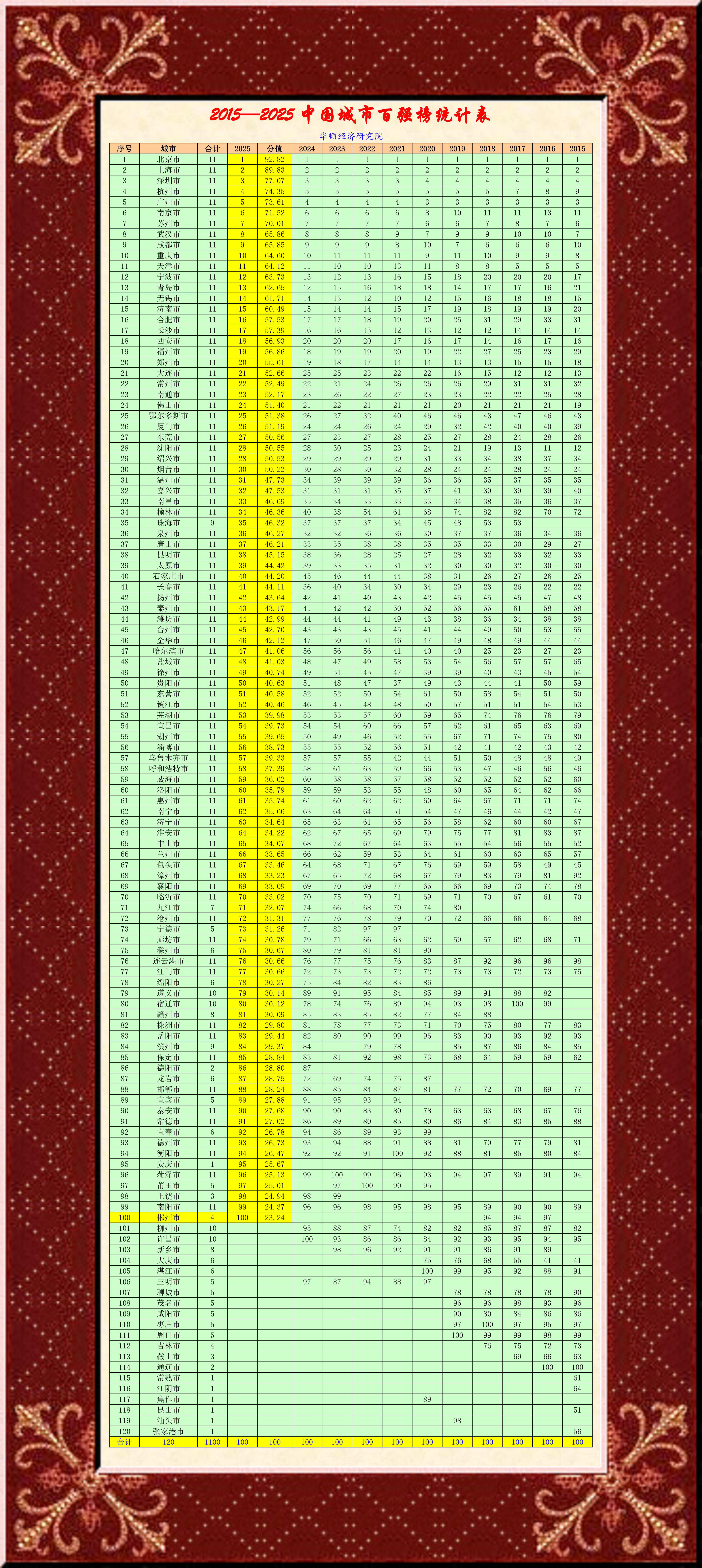 今年的榜單上,北京、上海、深圳、杭州、廣州、南京、蘇州、武漢、成都、重慶位居前十位,天津、寧波、青島、無(wú)錫、濟(jì)南、合肥、長(zhǎng)沙、西安、福州、鄭州居第11至第20位。杭州終于超越廣州,挺進(jìn)前四強(qiáng);寧波進(jìn)步一位,超越青島;合肥進(jìn)步一位,超越長(zhǎng)沙;西安進(jìn)步兩位,超越福州、鄭州。遵義、哈爾濱、榆林是位次進(jìn)步最多的城市,龍巖、鎮(zhèn)江是位次退步最多的城市。安慶新晉百?gòu)?qiáng)城市居第95位,莆田重返百?gòu)?qiáng)城市居第97位,郴州時(shí)隔七年重返百?gòu)?qiáng)榜單,居第100位,柳州、三明、許昌退出百?gòu)?qiáng)城市。