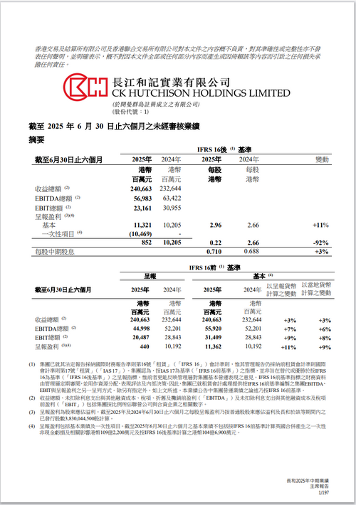 在營運方面,集團于2025年上半年按IFRS 16前基準(zhǔn)計算之基本盈利凈額按年穩(wěn)健增長11%至港幣113.62億元。錄得增長乃因以呈報貨幣計算之基本EBITDA及EBIT較2024年上半年分別增加7%及9%,主要由于港口部門增長強勁、零售部門有所改善、基建部門貢獻上升及CKHutchison Group Telecom(‘CKHGT’)與庫務(wù)業(yè)務(wù)均表現(xiàn)理想,以及集團因出售和黃醫(yī)藥部分非核心資產(chǎn)所錄得之收益。上半年因商品價格回落及大規(guī)模保養(yǎng)與檢修活動降低Cenovus Energy貢獻并對增長造成不利影響。