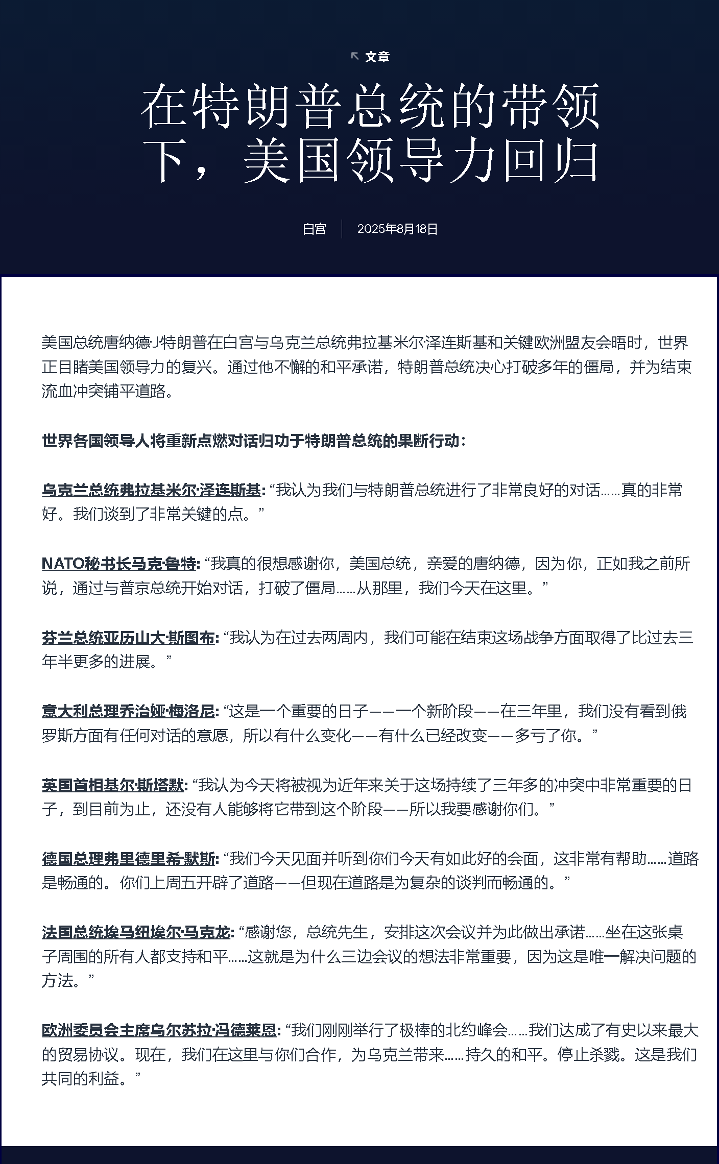 美國總統(tǒng)唐納德·J·特朗普在白宮與烏克蘭總統(tǒng)弗拉基米爾·澤連斯基和關(guān)鍵歐洲盟友會晤時,世界正目睹美國領(lǐng)導(dǎo)力的復(fù)興。通過他不懈的和平承諾,特朗普總統(tǒng)決心打破多年的僵局,并為結(jié)束流血沖突鋪平道路。