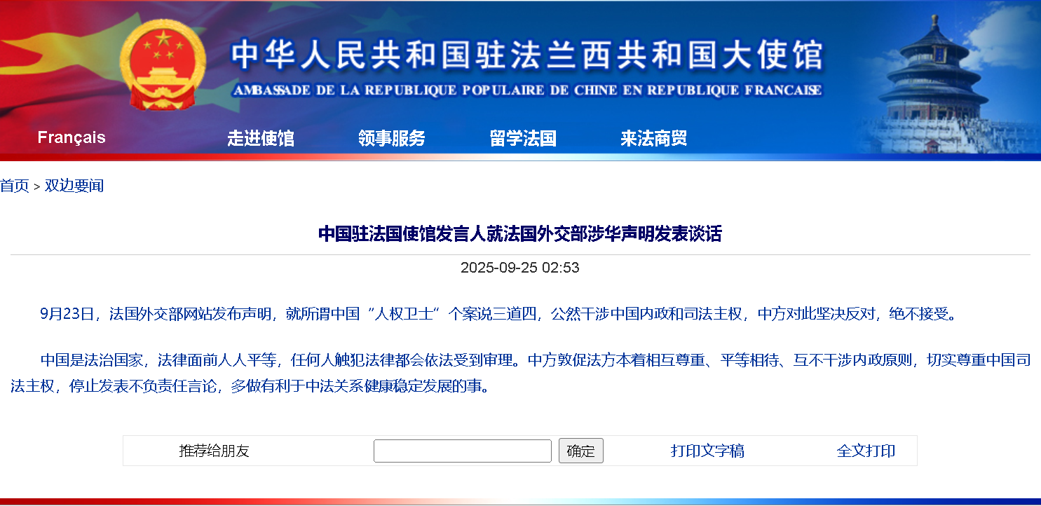 9月25日,中國駐法國使館發(fā)言人發(fā)表談話,對法國外交部9月23日發(fā)布的涉華聲明作出強(qiáng)硬回應(yīng)。中方用“堅(jiān)決反對、絕不接受”八個字,徹底劃清了紅線。