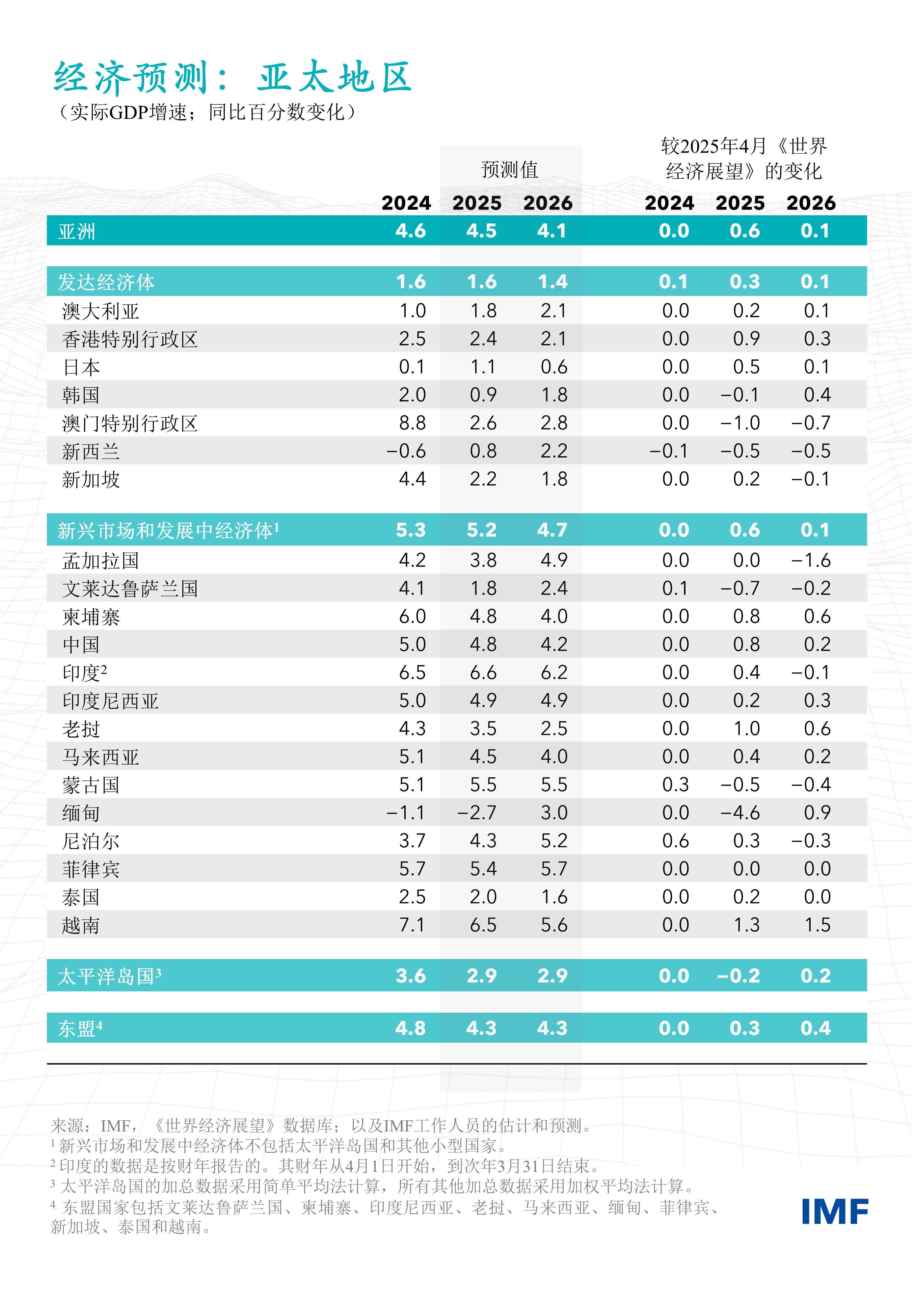 新華社香港10月24日電(黃茜恬)國際貨幣基金組織(IMF)24日在香港發(fā)布最新一期亞太地區(qū)經(jīng)濟展望報告,預(yù)計2025年亞太地區(qū)經(jīng)濟增速為4.5%,比4月預(yù)測提高0.6個百分點。
