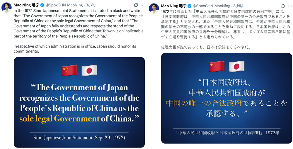 11月16日,中國(guó)外交部發(fā)言人毛寧在X網(wǎng)站用英語(yǔ)、日語(yǔ)雙語(yǔ)發(fā)布2組共4張海報(bào),援引1972年《中日聯(lián)合聲明》中涉臺(tái)內(nèi)容,提醒日方:“無(wú)論誰(shuí)當(dāng)政,日本都必須信守承諾”。
