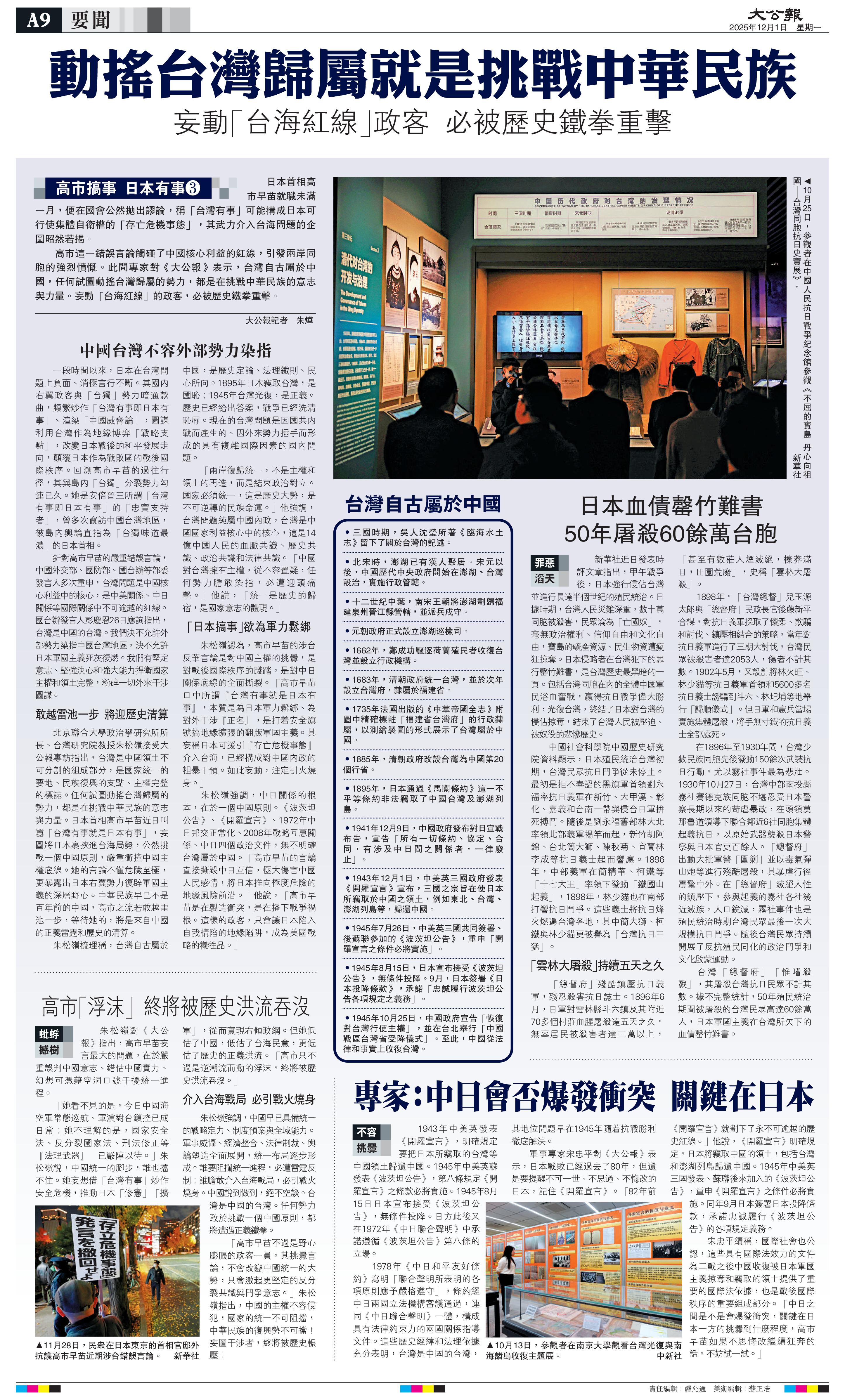 日方避而不談的,恐怕不僅僅是在臺灣問題上的立場。今天是《開羅宣言》發(fā)表82周年?!堕_羅宣言》等一系列國際法律文件不僅明確了中國對臺灣的主權(quán),更是世界反法西斯戰(zhàn)爭的重大成果,構(gòu)成戰(zhàn)后國際秩序的重要組成部分。遵守其有關(guān)規(guī)定是日方必須承擔(dān)的國際法義務(wù),也是戰(zhàn)后日本重獲國際社會接納的前提?,F(xiàn)在日方只字不提具有充分國際法效力的上述文件,卻一味引用一個把受日本殖民侵略最嚴(yán)重的亞洲鄰國特別是中國排斥在外的文件,這是對日本軍國主義侵略慘痛記憶的漠視,對世界反法西斯戰(zhàn)爭歷史真相的褻瀆,對聯(lián)合國權(quán)威和戰(zhàn)后國際秩序的公然挑戰(zhàn)。日方近年來大幅調(diào)整安保政策,逐年增加防衛(wèi)預(yù)算,圖謀修改“無核三原則”。日本某些勢力正極力突破“和平憲法”束縛,企圖違背國際法規(guī)定的戰(zhàn)敗國義務(wù)。這些人從未真正汲取歷史教訓(xùn),從未真正直面和反思日本在戰(zhàn)爭中犯下的滔天罪責(zé),從未真正遏止軍國主義在日本死灰復(fù)燃,反而企圖用美化侵略的敘事和“避而不談”的手法,讓世人遺忘,為自己“松綁”。這種伎倆欺騙不了世人。