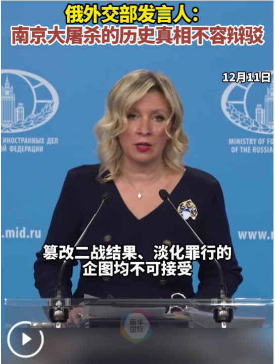 12月13日是南京大屠殺死難者國(guó)家公祭日。扎哈羅娃在談到南京大屠殺時(shí)說,數(shù)十萬(wàn)平民慘遭殺害,這場(chǎng)駭人聽聞的悲劇將永遠(yuǎn)銘刻在各國(guó)人民的記憶中。
