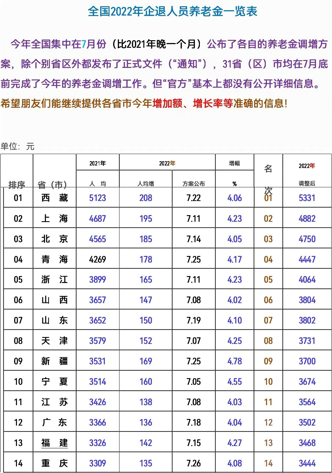2022年全國(guó)各地區(qū)退休人員基本養(yǎng)老金調(diào)整后人均估算表