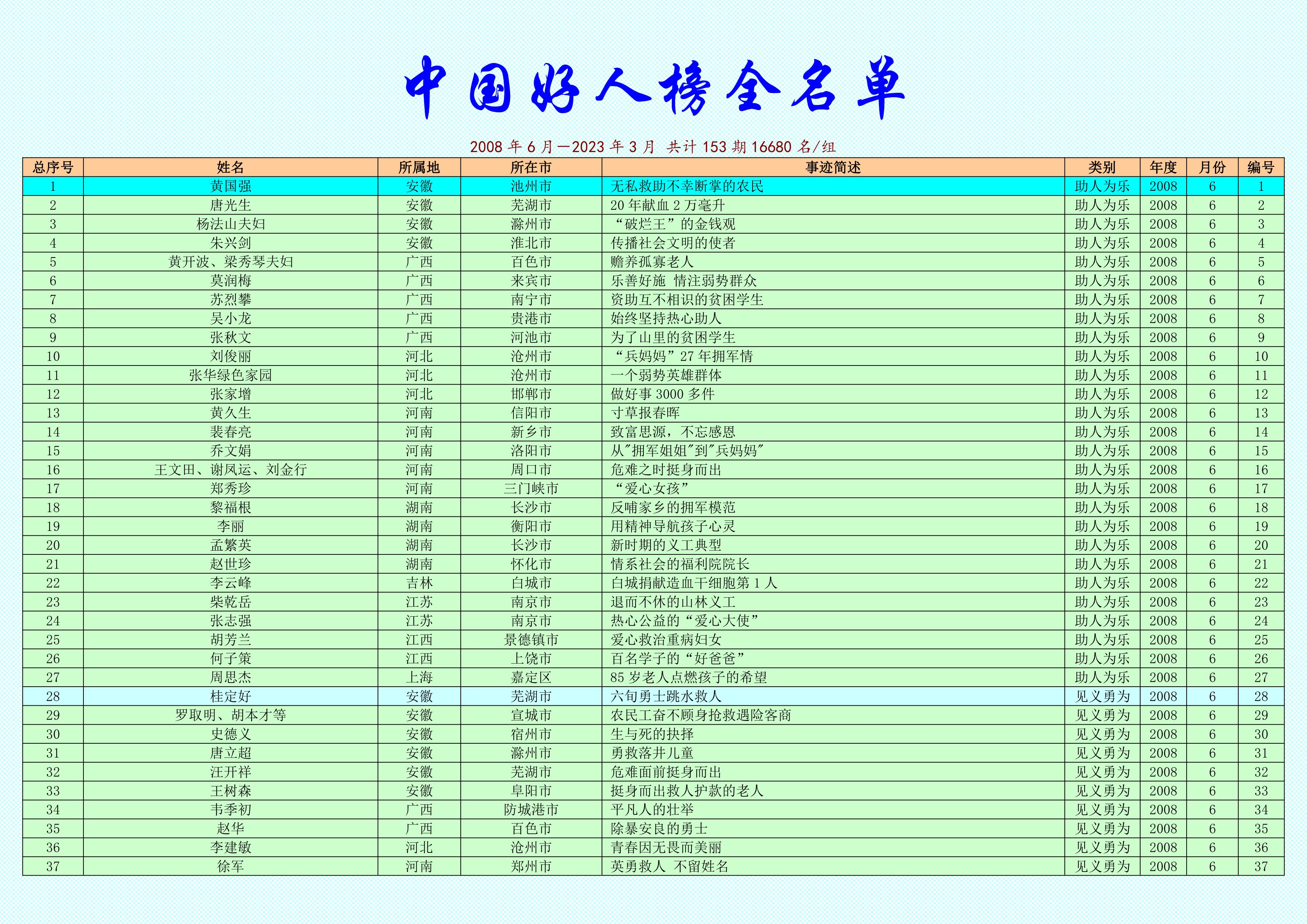 新華社鄭州6月21日電(記者韓朝陽)6月21日,2023年第一季度“中國好人榜”發(fā)布儀式暨全國道德模范與身邊好人現(xiàn)場交流活動在河南省洛陽市舉辦。經各地推薦、網友點贊評議和專家評審等環(huán)節(jié),共有150人(組)助人為樂、見義勇為、誠實守信、敬業(yè)奉獻、孝老愛親身邊好人光榮上榜。