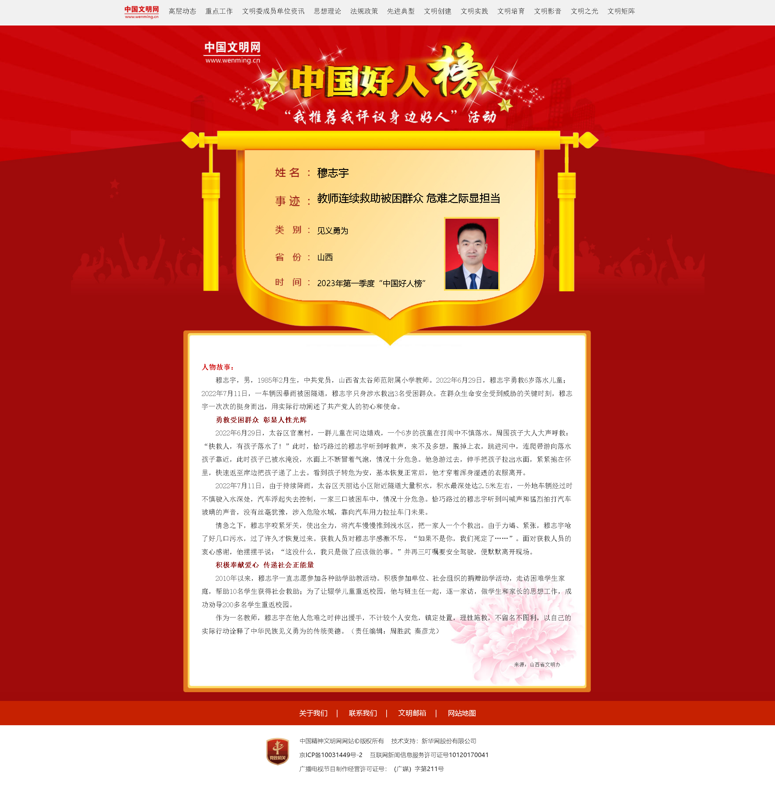 穆志宇,男,1985年2月生,中共黨員,山西省太谷師范附屬小學教師。2022年6月29日,穆志宇勇救6歲落水兒童;2022年7月11日,一車輛因暴雨被困隧道,穆志宇只身涉水救出3名受困群眾。在群眾生命安全受到威脅的關(guān)鍵時刻,穆志宇一次次的挺身而出,用實際行動闡述了共產(chǎn)黨人的初心和使命。