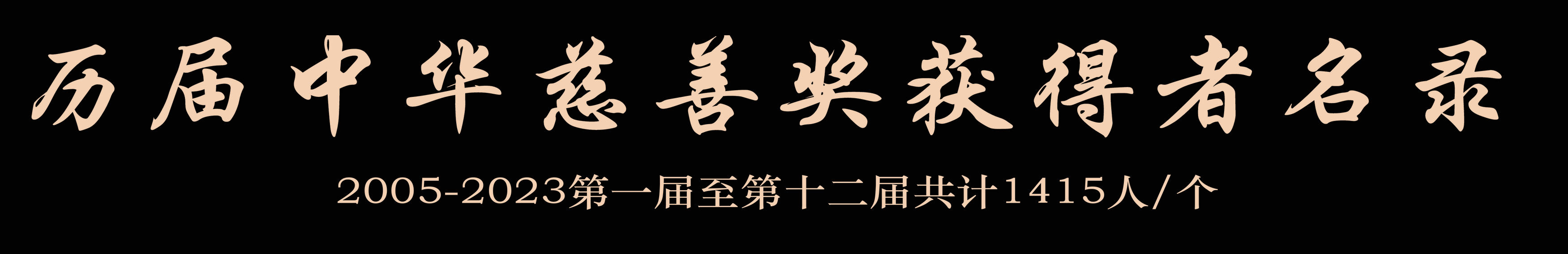 1. 李嘉誠 終身榮譽獎 第二屆2. 邵逸夫 終身成就獎 第三屆3. 曹德旺 第四屆4. 曹德旺 第五屆5. 曹德旺 第六屆6. 曹德旺 第七屆7. 曹德旺 第八屆8. 曹德旺 第十屆9. 曹德旺 第十一屆10. 曹德旺 第十二屆11. 曹鵬 第十一屆12. 曹其鏞 第六屆13. 曹興誠 第四屆14. 曾憲梓 第一屆15. 曾憲梓 第四屆16. 曾憲梓(中國香港) 第九屆17. 陳柏華 第四屆18. 陳炳炎 第四屆19. 陳東升 第十一屆20. 陳逢干 第四屆21. 陳逢干 第五屆22. 陳逢干 第六屆23. 陳逢干 第七屆24. 陳逢干 第八屆25. 陳輔唐 第二屆26. 陳光標(biāo) 第三屆27. 陳光標(biāo) 第四屆28. 陳光標(biāo) 第五屆29. 陳光標(biāo) 第六屆30. 陳廣川 第七屆31. 陳華 第四屆32. 陳劍光 第十二屆33. 陳江和 第四屆34. 陳江和(印度尼西亞) 第十屆35. 陳立仁 第四屆36. 陳梁悅明 第一屆37. 陳美儀(女) 第十一屆38. 陳明金 第十一屆39. 陳榮超 第一屆40. 陳水波 第四屆41. 陳偉鴻 第八屆42. 陳賢(女) 第十屆43. 陳曉穎 第四屆44. 陳一丹 第九屆45. 陳一丹 第八屆46. 陳澤盛 第一屆47. 陳正拜 第十屆48. 陳正拜 第十一屆49. 陳祖?zhèn)?第四屆50. 成鳳桂(女) 第十屆51. 成龍 第一屆52. 程紅光(女) 第十一屆53. 儲吉旺 第一屆54. 叢飛 第一屆55. 崔根良 第七屆56. 崔根良 第十屆57. 崔榮華(女) 第十一屆58. 崔如琢 第四屆59. 崔永元 第七屆60. 戴志慶 第四屆61. 黨彥寶 第七屆62. 黨彥寶 第八屆63. 黨彥寶 第九屆64. 黨彥寶 第十一屆65. 黨彥寶 第十二屆66. 迪亞拉 第七屆67. 翟美卿(女) 第十屆68. 翟長慶 第七屆69. 丁和木 第七屆70. 丁耀先 第八屆71. 丁玉萍(女) 第十二屆72. 董才平 第四屆73. 董配永 第四屆74. 董配永 第六屆75. 董淑貞(女,英國) 第十二屆76. 豆紅波 第七屆77. 杜麗梅(女) 第十一屆78. 段友清 第十一屆79. 方黃吉雯 第一屆80. 方慶云 第八屆81. 方潤華 第一屆82. 方威 第四屆83. 房忠 第十屆84. 馮艾 第一屆85. 馮笑原 第四屆86. 傅芬芳(女) 第十屆87. 傅光明 第十一屆88. 高德康 第七屆89. 高永華 第一屆90. 高鎮(zhèn)同 第十一屆91. 耿福能 第十一屆92. 龔俊龍 第十一屆93. 古潤金 第四屆94. 古潤金 第五屆95. 古潤金 第六屆96. 古潤金 第七屆97. 古潤金 第八屆98. 古潤金(馬來西亞) 第九屆99. 古潤金(馬來西亞) 第十屆100. 關(guān)杰初 第十二屆101. 關(guān)牧村 第一屆102. 郭海良 第八屆103. 郭明義愛心團隊 第十一屆104. 郭生芳(女) 第十屆105. 郭勝華 第一屆106. 郭文標(biāo) 第九屆107. 過鑫富 第四屆108. 哈學(xué)忠 第十二屆109. 海霞(女,回族) 第十二屆110. 韓紅 第七屆111. 韓汝芬 第四屆112. 韓召善 第一屆113. 何鴻燊 第四屆114. 何其新 第四屆115. 何偉 第十屆116. 何猷龍 第四屆117. 黑李景榮 第一屆118. 侯建芳 第十屆119. 侯立尊 第一屆120. 侯振國 第十屆121. 胡賢斌 第十二屆122. 胡亞捷、湯靜夫婦 第十屆123. 胡子敬 第六屆124. 黃炳均夫婦 第八屆125. 黃宏、李莉夫婦 第十一屆126. 黃啟鳳 第十二屆127. 黃如論 第一屆128. 黃如論 第二屆129. 黃如論 第四屆130. 黃如論 第五屆131. 黃如論 第六屆132. 黃如論 第七屆133. 黃如論 第八屆134. 黃如論 第九屆135. 黃少康 第十二屆136. 黃濤 第十一屆137. 黃濤 第十一屆138. 黃濤 第十二屆139. 黃志源(新加坡) 第十一屆140. 霍慶華 第四屆141. 霍英東 第一屆142. 吉美堅贊 第一屆143. 賈秀芳(女) 第十屆144. 姜純 第四屆145. 姜達(dá)敖 第四屆146. 姜達(dá)敖 第五屆147. 姜麗娟 第四屆148. 金金龍 第一屆149. 金林玉 第四屆150. 闞麗君(女) 第十屆151. 柯希平 第四屆152. 克力木?依莫拉 第六屆153. 孔東梅(女) 第十二屆154. 孔維(女) 第十一屆155. 孔祥銀 第八屆156. 匡俊英 第四屆157. 匡俊英 第六屆158. 匡俊英 第七屆159. 藍(lán)勇 第一屆160. 樂愛妹 第五屆161. 雷軍 第十一屆162. 李愛君 第四屆163. 李安平 第六屆164. 李春鳳 第六屆165. 李春平 第四屆166. 李春平 第六屆167. 李春平 第七屆168. 李春平 第八屆169. 李春元 第一屆170. 李達(dá)三(新加坡) 第十屆171. 李廣元 第五屆172. 李宏祥 第九屆173. 李厚霖 第四屆174. 李家杰 第三屆175. 李嘉誠 第一屆176. 李金元 第一屆177. 李金元 第四屆178. 李立華(女) 第十二屆179. 李明剛 第十二屆180. 李寧 第一屆181. 李寧 第六屆182. 李寧 第六屆183. 李清友 第四屆184. 李泉 第六屆185. 李思廉 第一屆186. 李思廉 第四屆187. 李濤 第十一屆188. 李萬升 第十二屆189. 李文達(dá) 第四屆190. 李賢義 第四屆191. 李相岑 第九屆192. 李新炎 第四屆193. 李一萍(女) 第十二屆194. 李蔭濃、陳春琳 第七屆195. 李永波 第五屆196. 李玉蘭 第一屆197. 李玉玲 第四屆198. 李運強 第一屆199. 李兆會 第四屆200. 勵娜 第八屆201. 梁博 第十二屆202. 廖艷暉 第四屆203. 廖澤云 第十二屆204. 林德興 第十二屆205. 林瑞班 第一屆206. 林圣雄 第一屆207. 林賢友 第一屆208. 林新華 第四屆209. 林秀貞 第八屆210. 凌鋒 第四屆211. 劉彪 第八屆212. 劉冰 第四屆213. 劉滄龍 第四屆214. 劉桂薌(女) 第十二屆215. 劉海鷹 第十一屆216. 劉建民 第四屆217. 劉景萍(女) 第十二屆218. 劉猛 第五屆219. 劉瑞旗 第四屆220. 劉紹喜 第四屆221. 劉盛蘭 第九屆222. 劉文福 第十二屆223. 劉許政 第十屆224. 劉英子(女) 第十二屆225. 劉永好 第十一屆226. 劉勇 第七屆227. 劉志強 翟美卿 第一屆228. 樓明 第四屆229. 盧志強 第四屆230. 魯家賢(奧地利) 第十一屆231. 陸仁軍 第十一屆232. 羅賓?西爾(英國) 第九屆233. 羅淑蘭 第一屆234. 羅永田 第