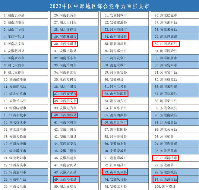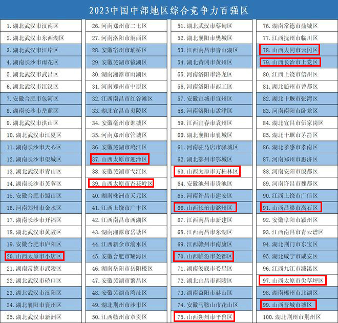 近日,競(jìng)爭(zhēng)力智庫(kù)等機(jī)構(gòu)在北京發(fā)布《中國(guó)縣域發(fā)展監(jiān)測(cè)報(bào)告2023》,揭曉“2023中國(guó)綜合競(jìng)爭(zhēng)力百?gòu)?qiáng)縣市”等名單,太原市清徐縣入圍“2023中國(guó)中部地區(qū)綜合競(jìng)爭(zhēng)力百?gòu)?qiáng)縣市”,太原市小店區(qū)、迎澤區(qū)、杏花嶺區(qū)、萬(wàn)柏林區(qū)、尖草坪區(qū)入圍“2023中國(guó)中部地區(qū)綜合競(jìng)爭(zhēng)力百?gòu)?qiáng)區(qū)”。