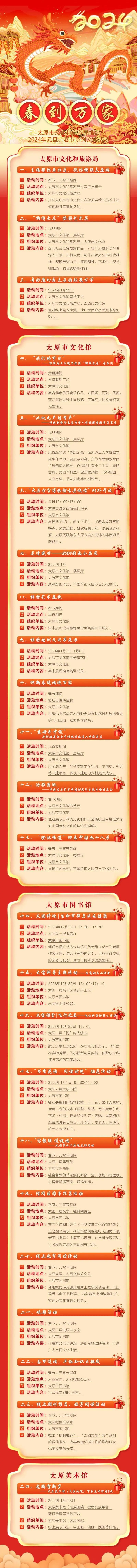 本報(bào)訊(記者 陳辛華)2024年元旦、春節(jié)將至,太原市文化和旅游局聯(lián)合各縣(市、區(qū))文旅系統(tǒng)推出“春到萬(wàn)家”元旦、春節(jié)系列文化活動(dòng),共133項(xiàng),豐富節(jié)日期間群眾精神文化生活,營(yíng)造歡樂(lè)吉祥、溫暖和順的濃厚節(jié)日氛圍。