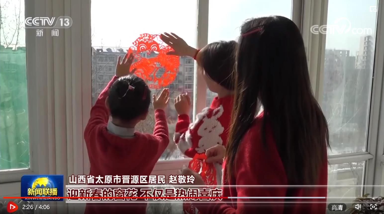 “在山西太原,‘五福臨門’‘玉兔迎春’等主題豐富的窗花,讓節(jié)日氣氛越發(fā)濃厚?!?a target="_blank">《新聞聯(lián)播》在《張燈結(jié)彩慶新春 喜慶祥和中國(guó)年》報(bào)道中,展示了太原市民剪窗花迎新春的喜悅。晉源區(qū)居民趙敬玲說:“迎新春的窗花,不僅僅是熱鬧喜慶,也寄托了我們對(duì)新春的祝愿?!?