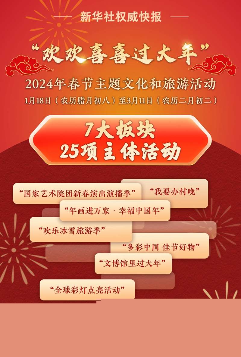 1月18日,文化和旅游部舉行媒體推介會(huì),發(fā)布“歡歡喜喜過(guò)大年”2024年春節(jié)主題文化和旅游活動(dòng)。活動(dòng)于1月18日(農(nóng)歷臘月初八)至3月11日(農(nóng)歷二月初二)開展,包含7大板塊共計(jì)25項(xiàng)主體活動(dòng)。