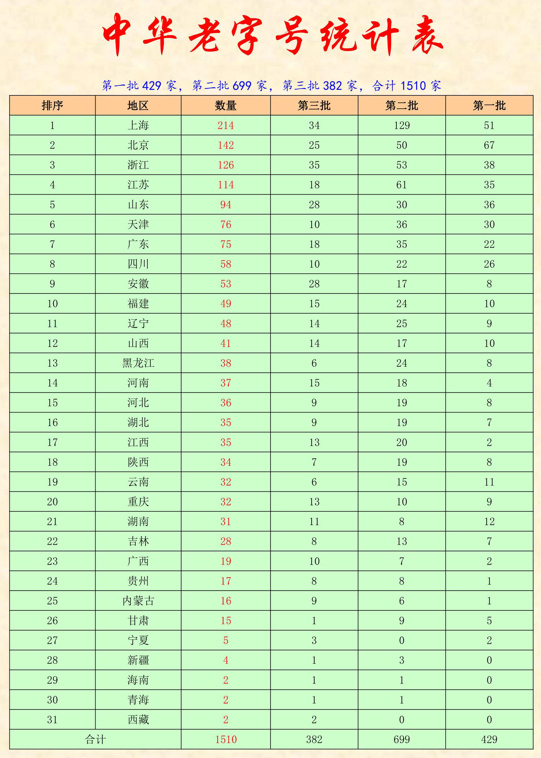 為貫徹黨中央、國務(wù)院決策部署,落實中央經(jīng)濟(jì)工作會議精神,推動老字號守正創(chuàng)新發(fā)展,根據(jù)《中華老字號示范創(chuàng)建管理辦法》,經(jīng)企業(yè)申報、地方推薦、社會公示,商務(wù)部、文化和旅游部、市場監(jiān)管總局、國家知識產(chǎn)權(quán)局、國家文物局決定將382個品牌認(rèn)定為第三批中華老字號,現(xiàn)予公布。