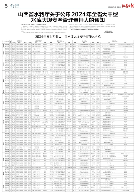 根據(jù)《水庫大壩安全管理條例》,按照省政府辦公廳《關(guān)于加強水庫安全管理工作的意見》(晉政辦發(fā)〔2023〕59號)和水利部辦公廳《關(guān)于落實2024年水庫大壩安全責(zé)任人的通知》(辦運管函〔2024〕52號)要求,現(xiàn)將2024年度全省83座大中型水庫大壩安全責(zé)任人名單予以公布。