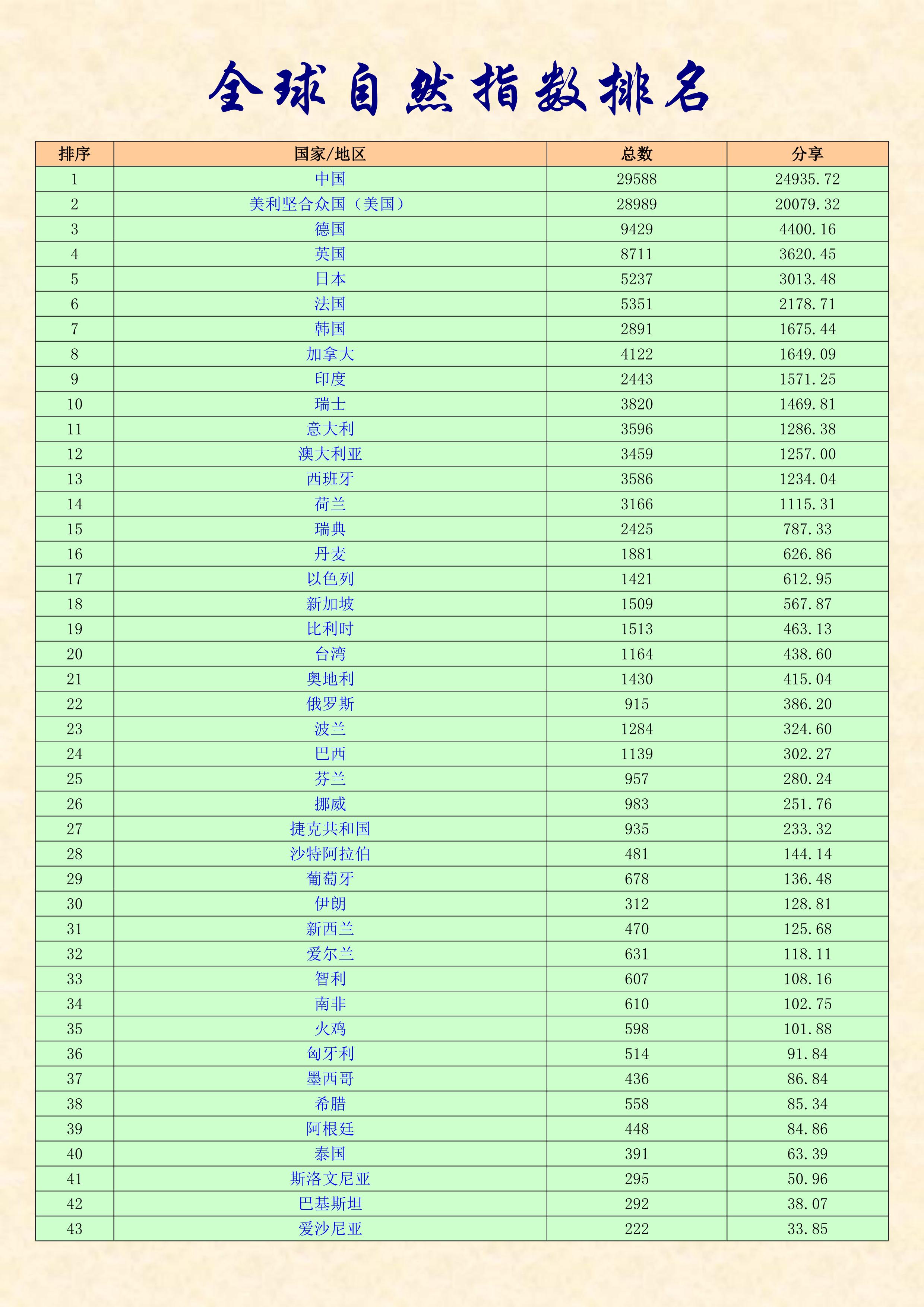 排名 國(guó)家/地區(qū) 總數(shù) 分享