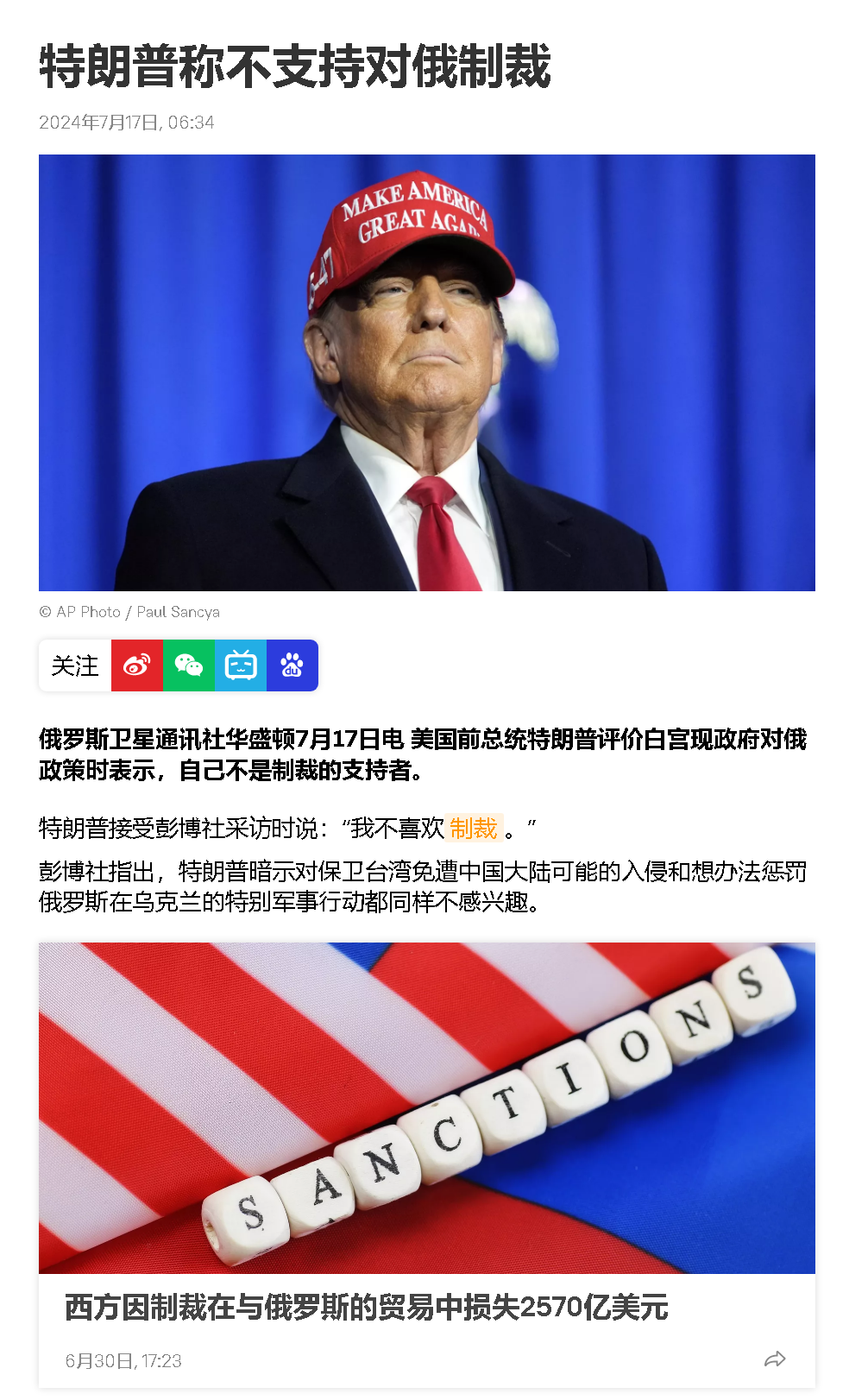 俄羅斯衛(wèi)星通訊社華盛頓7月17日電 美國前總統(tǒng)特朗普評價白宮現(xiàn)政府對俄政策時表示,自己不是制裁的支持者。